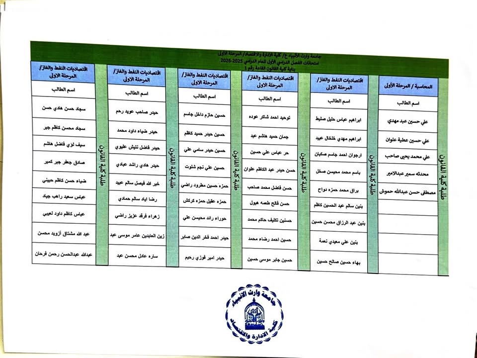 خريطة الجلوس حسب القاعات الامتحانية للمرحلة الاولى ولكافة اقسام الكلية.،