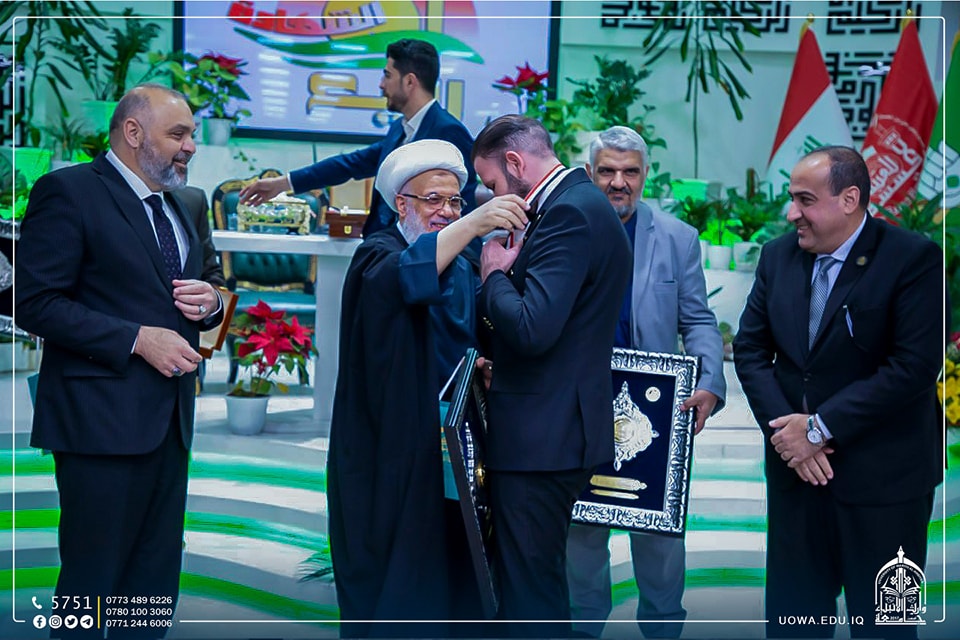 على هامش "مهرجان ربيع الشهادة" كّرم المتولي الشرعي للعتبة الحسينية المقدسة سماحة الشيخ عبد المهدي الكربلائي (دام عزه)، وبحضور السيد رئيس الجامعة الاستاذ الدكتور ابراهيم الحياوي والاستاذ الدكتور واقد الموسوي عميد كلية الهندسة ضمن فقرة تكريم العراقيين المبدعين مجموعة من خريجي جامعة وارث الانبياء (عليه السلام) عن بحوث تخرجهم بحضور عدد من التدريسيين والطلبة وأولياء الأمور فضلا عن ضيوف المهرجان من خارج العراق الذين أبدو انبهارهم واندهاشهم بنوع البحوث أثناء العرض والتي ترتقي إلى مستوى الدراسات العليا.