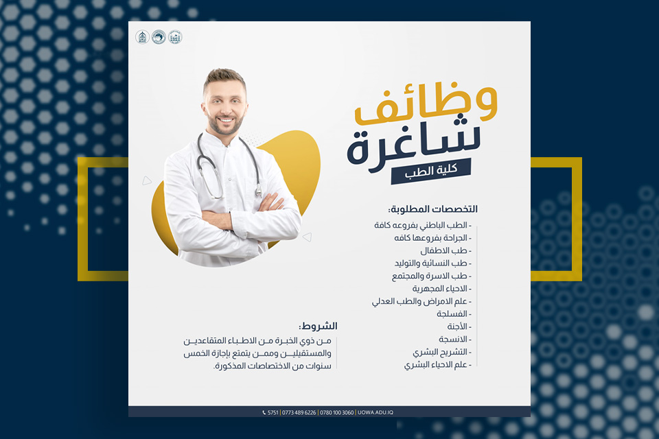 تعلن كلية الطب في جامعة وارث الأنبياء (عليه السلام) عن حاجتها لتعيين أطباء في التخصصات التالية: