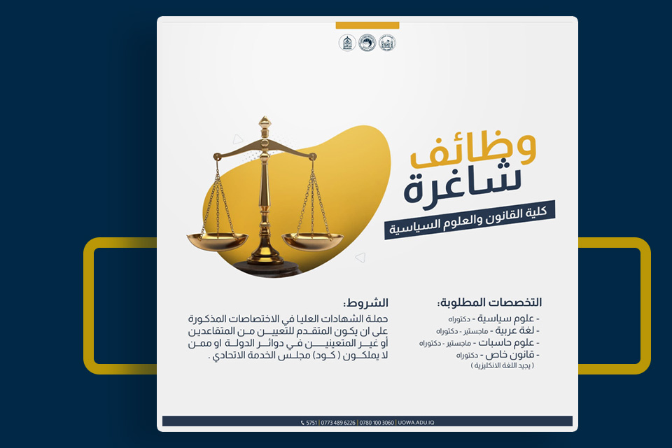 أعلنت كلية القانون في جامعة وارث الأنبياء (عليه السلام) عن توفر درجات وظيفية لحملة الشهادات العليا (ماجستير أو دكتوراه) في تخصصات علوم الحاسبات وهندسة الحاسبات. الوظائف متاحة للمتقاعدين وغير المعينين في دوائر الدولة. يُرجى من الراغبين بالتقديم مراجعة عمادة الكلية في مبنى كلية القانون، مصطحبين معهم المستمسكات الثبوتية والسيرة الذاتية.