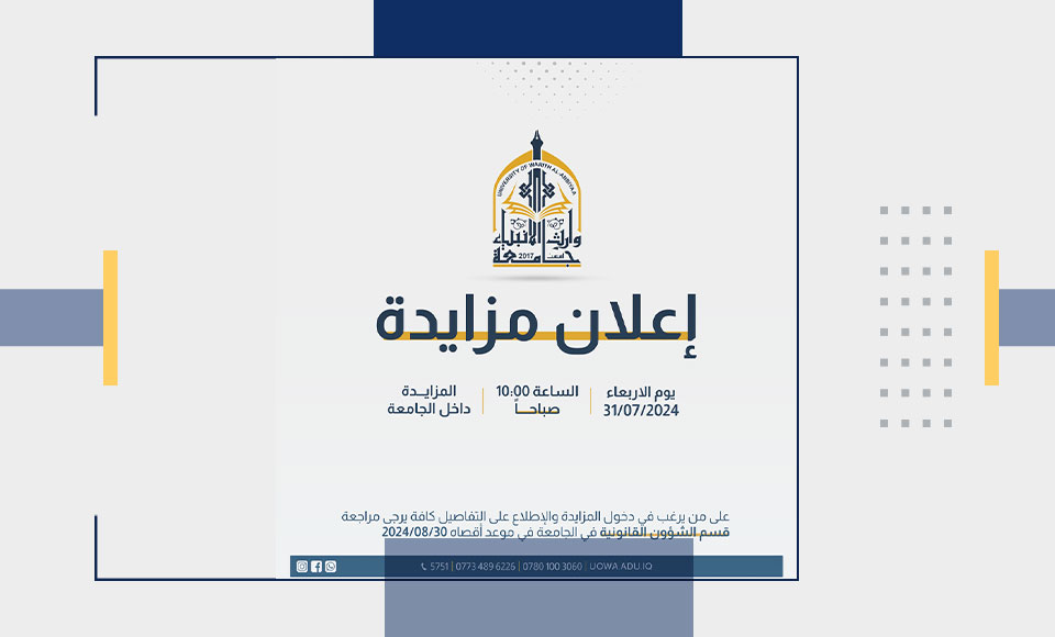 تعلن جامعة وارث الأنبياء (عليه السلام) عن إجراء مزايدة علنية داخل الحرم الجامعي لبيع المواد المستعملة، وذلك لفترة محدودة. للراغبين في الحصول على مزيد من التفاصيل، يرجى مراجعة قسم الشؤون القانونية في الطابق الثاني من بناية العلى بالجامعة.