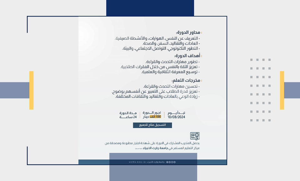 تعلن جامعة وراث الانبياء(عليه السلام) عن فتح الحجز للاختبار الوطني العراقي للغة الانكليزية الموحد.