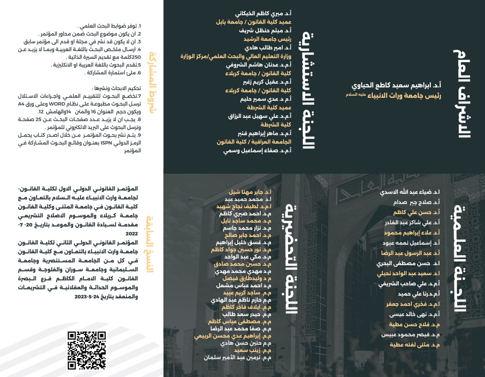 تتشرف كلية القانون في جامعة وارث الأنبياء بدعوة الباحثين والأكاديميين للمشاركة في "مؤتمرها القانوني الثالث" المقرر عقده تحت شعار "السلم الإجتماعي: الوسائل والتحديات". يأتي هذا بالتعاون مع كليات القانون في جامعة كربلاء، وجامعة بابل، والجامعة العراقية، وكلية الشرطة.