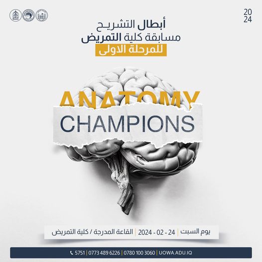 بمبادرة من عمادة كلية التمريض وتحت رعاية السيد عميد الكلية، تعلن الكلية عن إطلاق مسابقة بعنوان "أبطال التشريح " (Anatomy champions). تأتي هذه المسابقة بهدف تشجيع طلاب المرحلة الأولى واختبار معرفتهم ومهاراتهم في مجال التشريح.