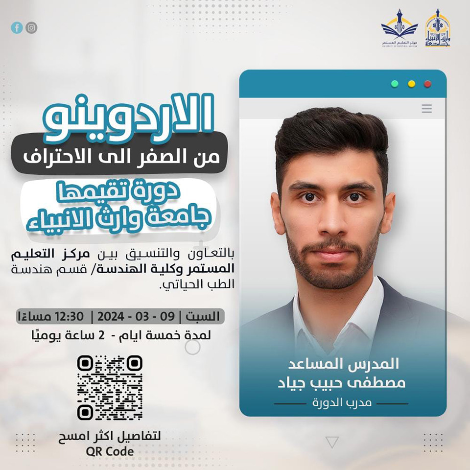 تعلن جامعة وارث الأنبياء (عليه السلام) عن إطلاق دورة تدريبية مميزة بعنوان (الأردوينو من الصفر إلى الاحتراف)، بالتعاون والتنسيق بين مركز التعليم المستمر وكلية الهندسة- قسم هندسة الطب الحياتي.