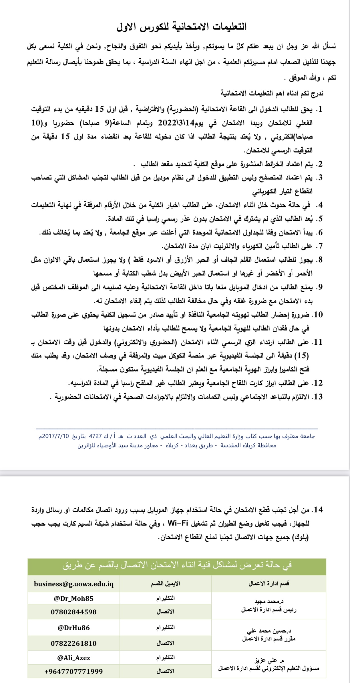 جدول الامتحانات النهائية للمرحلة الاولى لقسم ادارة الاعمال مع التعليمات