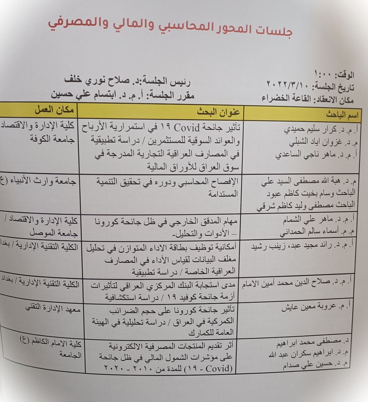 القاها كل من السيد (رافل فيصل حسن / نقيب المحاسبين والمدققين / فرع كربلاء) والسيد (م. م عبدالله سلام مجيد / تدريسي في قسم المحاسبة /كلية الادارة والاقتصاد /جامعة وارث الأنبياء - عليه السلام -) في يوم الثلاثاء الموافق ٢٠٢٢/٥/١٧.