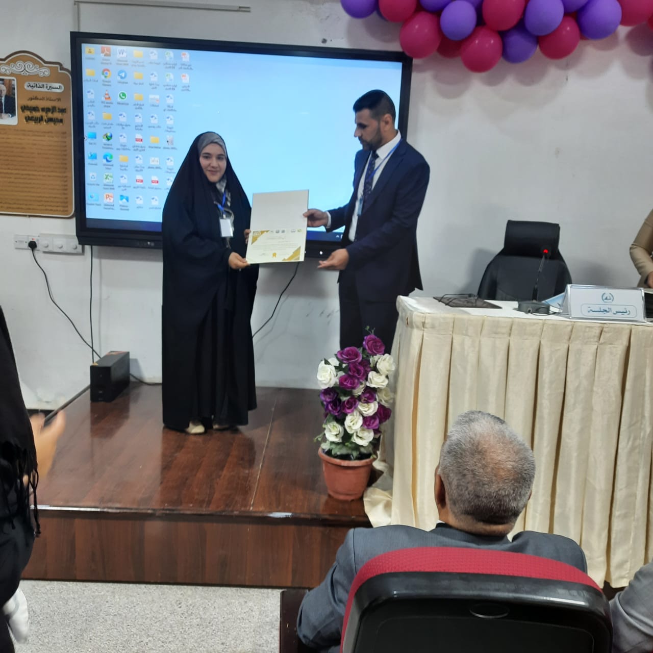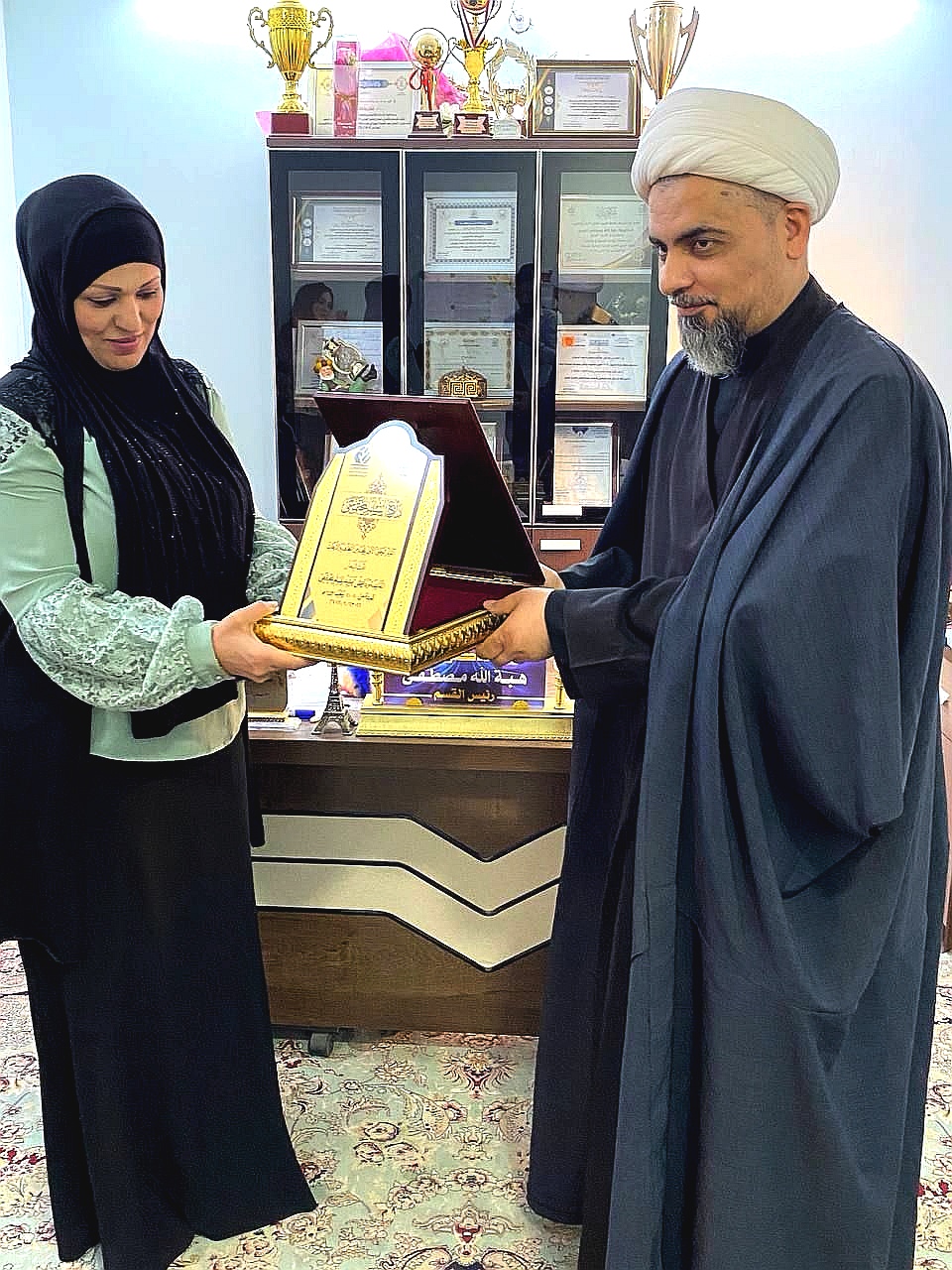 تقديرا للجهود المبذولة تم تكريم السيدة رئيس قسم المحاسبة (م.د هبة الله مصطفى السيد) بصفتها عضوا ومقررا في اللجنة العلمية بدرع السلم المجتمعي من قبل السيد رئيس اللجنة التحضيرية الشيخ؛ (علي القرعاوي) في المؤتمر الذي اقيم في العتبة الحسينية المقدسة الموسوم (المؤتمر الوطني الاول للحد من التطرف والارهاب).