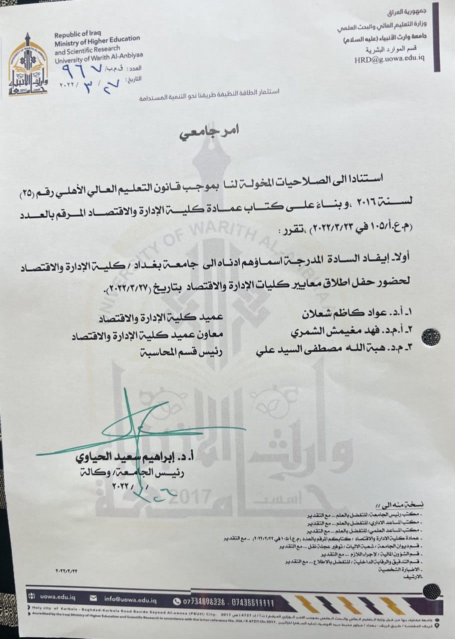 بفضل الله تم إطلاق اطلاق المعايير البرامجيه الوطنيه لكليات الادارة والاقتصاد في يوم ٢٨ / ٣ /٢٠٢٢ وبحضور كليات الادارة والاقتصاد الحكوميه والأهلية .اذ تم دعوة كل من الاستاذ الدكتور عواد الخالدي عميد كلية الادارة والاقتصاد ألاستاذ المساعد الدكتور فهد الشمريوالمدرس الدكتورة هبة الله مصطفى