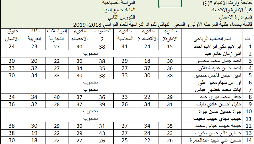 السعيات النهائية للكورس الثاني -قسم ادارة الاعمال مرحلة الاولى وللدراسة الصباحية والمسائية /2018-2019
