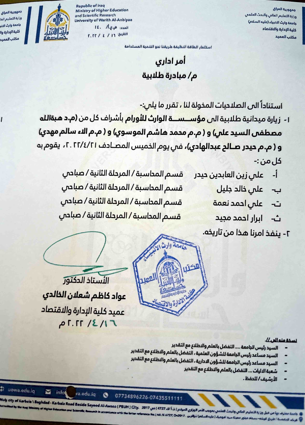زار طلبة كلية الادارة والاقتصاد مؤسسة وارث للاورام باشراف كل من ( م.د هبة الله مصطفى السيد ) و ( م.م محمد هاشم الموسوي ) و ( م.م الاء سالم مهدي ) و ( م.م حيدر صالح عبد الهادي )