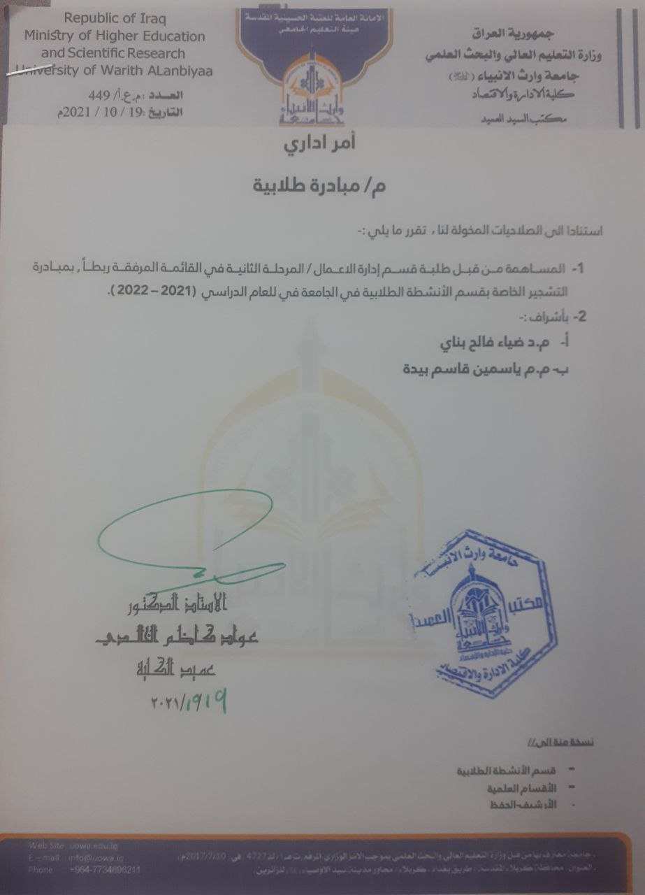 شارك فريقين من كلية الادارة والاقتصاد لقسم ادارة الاعمال المرحلة الثانية والثالثة والرابعة في بطولة وارث للكرة الخماسية