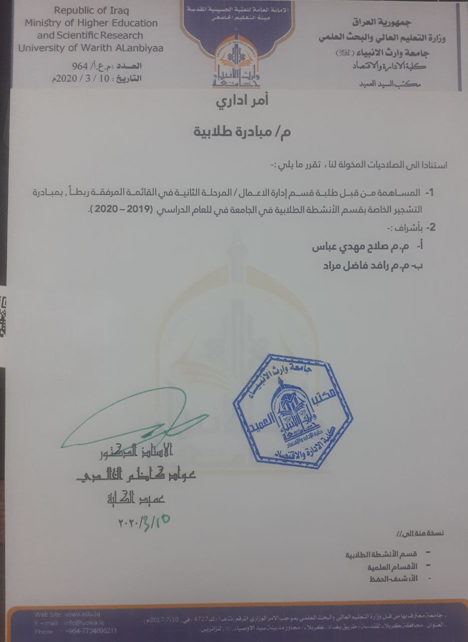 شارك مجموعة من طلبة كلية الادارة والاقتصاد قسم ادارة الاعمال المرحلة الثانية بمبادرة التشجير الخاصة بقسم الانشطة الطلابية في الجامعة