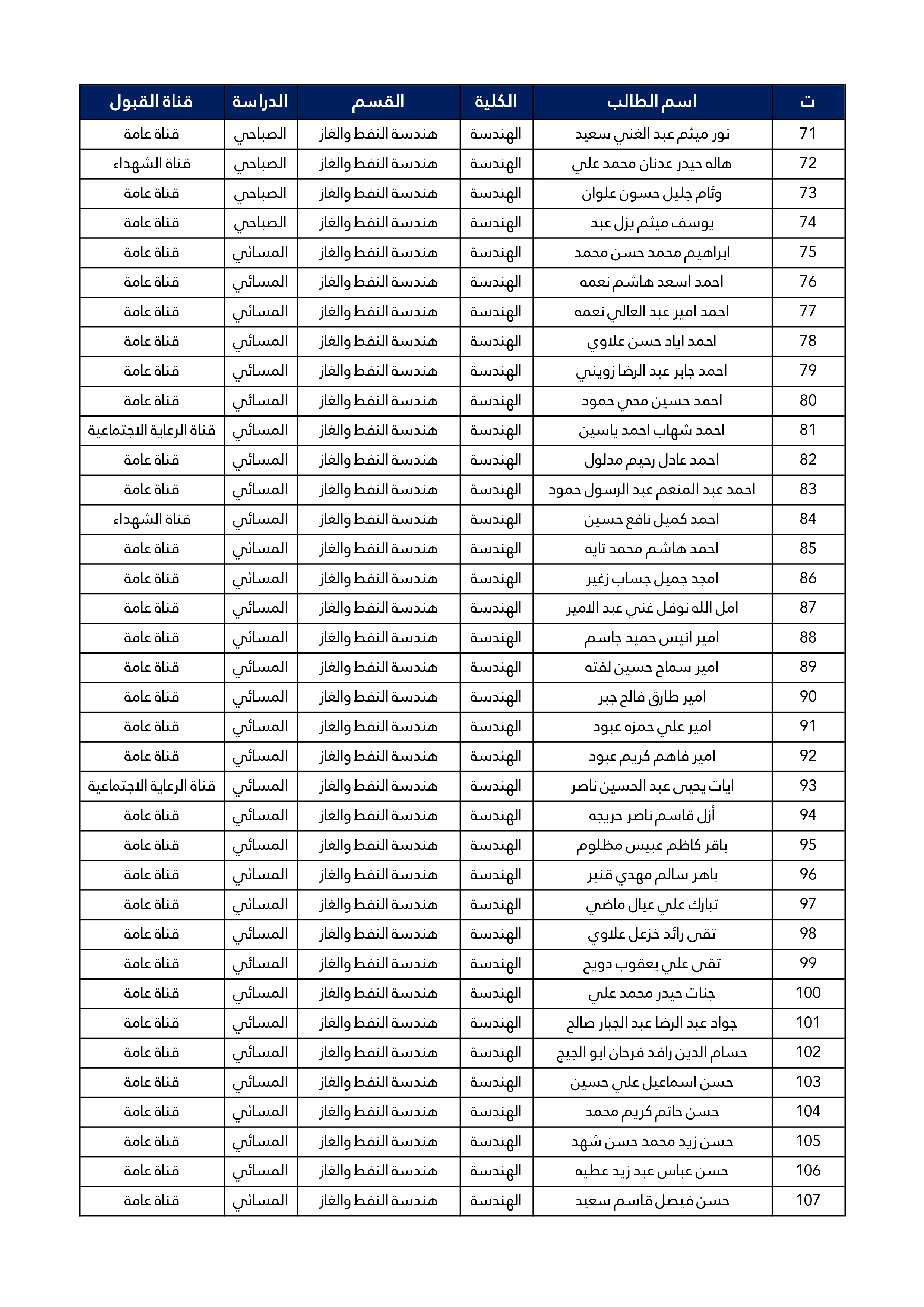 اسماء الطلبة المقبولين في قسم هندسة النفط و الغاز للعام الدراسي 2025/2024 للدراستين الصباحية و المسائية