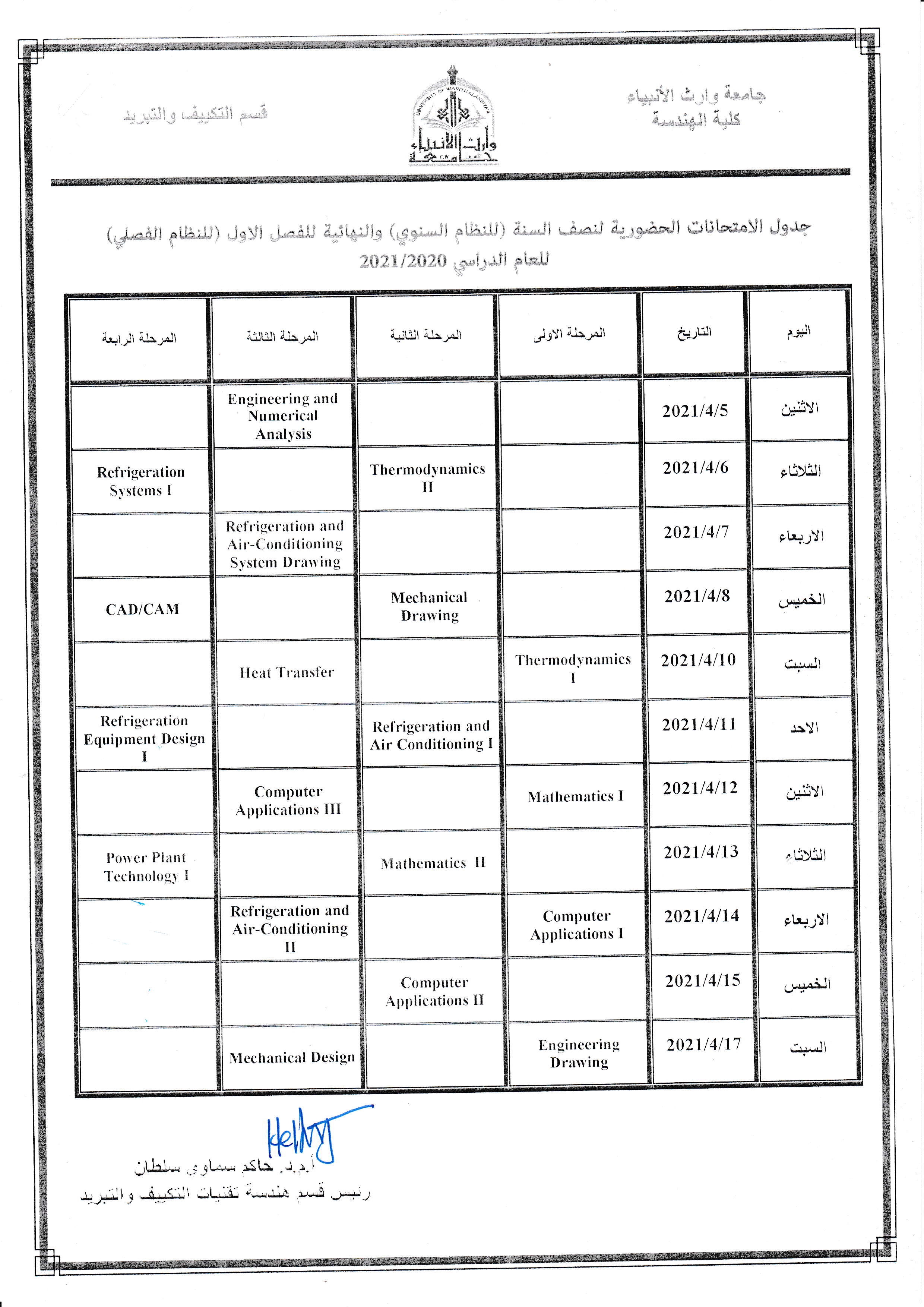 نرفق أليكم جداول الامتحانات الحضورية لجميع الأقسام العلمية