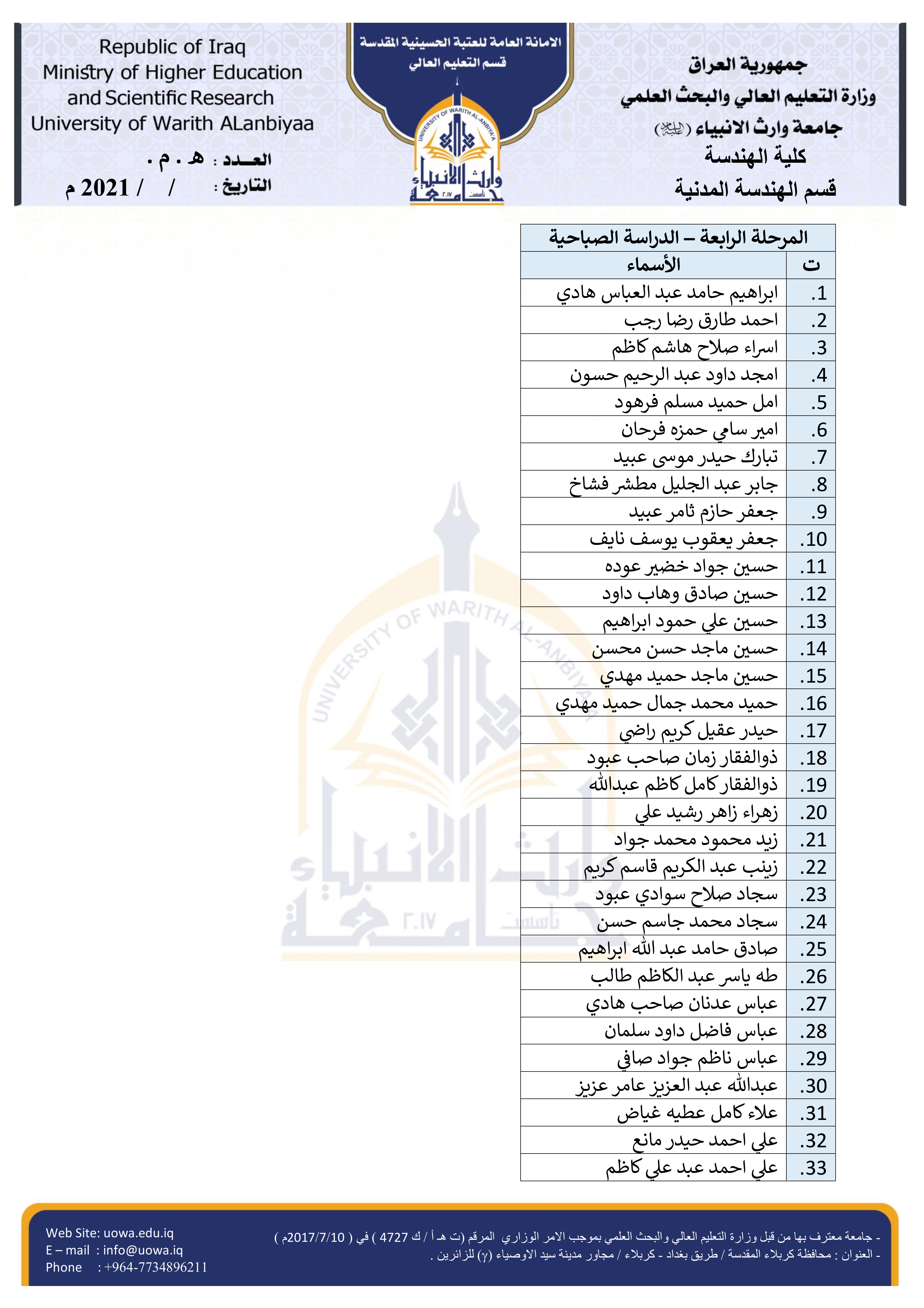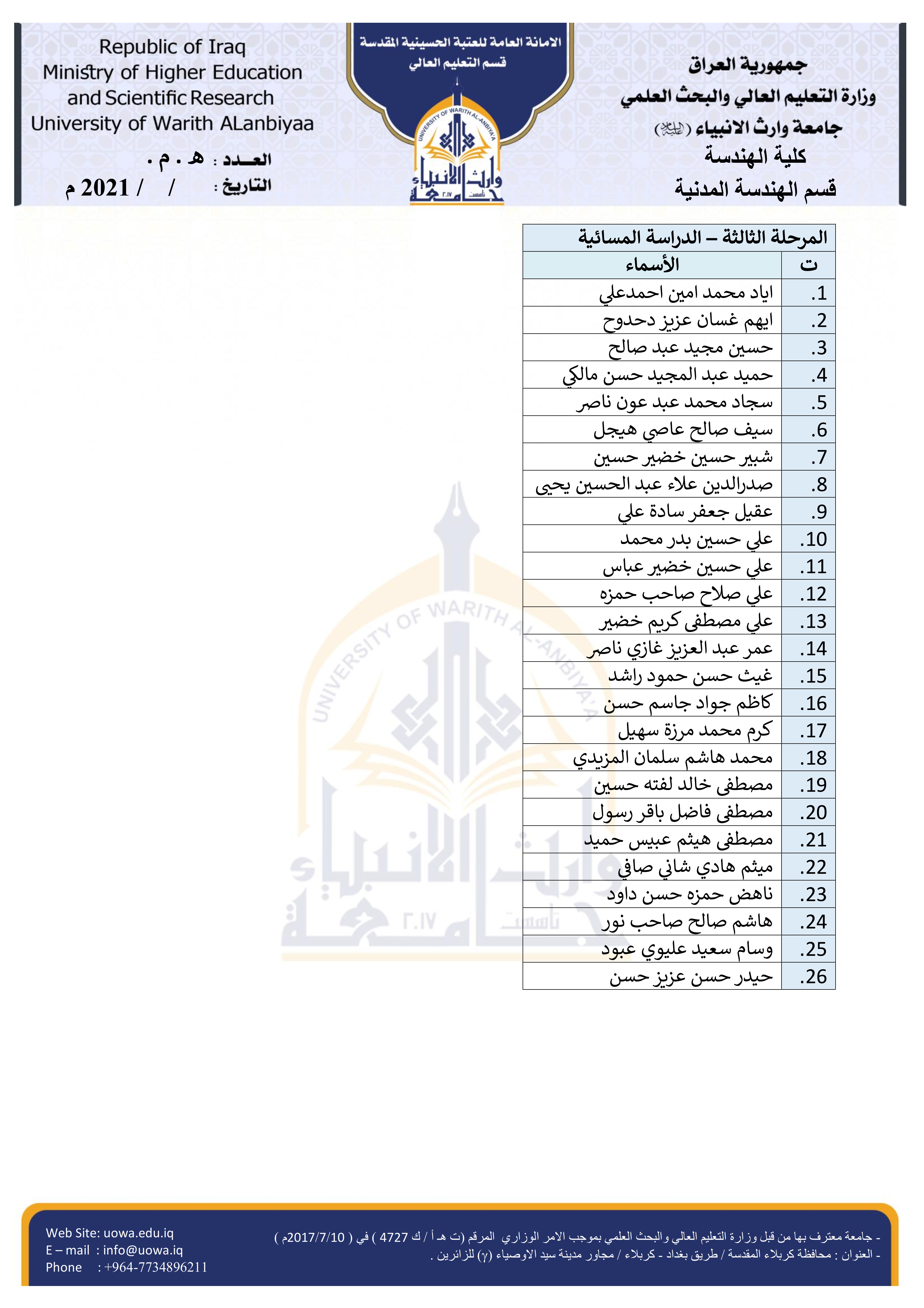 أدناه قوائم الأسماء الخاصة بالطلبة المشمولين بالامتحانات الحضورية لقسم الهندسة المدنية.