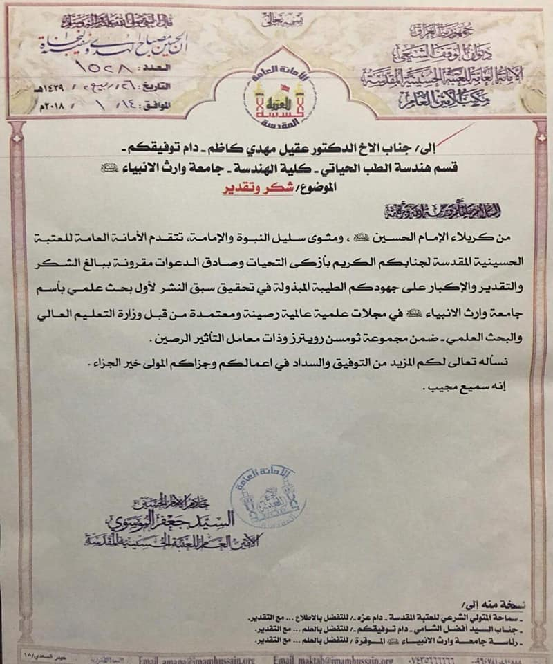 قدمت الامانة العامة للعتبة الحسينية المقدسة ورئاسة جامعة وارث الانبياء كتابِ شُكرٍ وتقديرالى الدكتور (عقيل مهدي كاظم) التدريسي في كلية الهندسة (قسم هندسة الطب الحياتي) لنشره اول بحثيين رصينين بأسم جامعة وارث الانبياء (عليه السلام) في مجلات ((Thomson Reuters( العالمية ذات معامل التأثير الرصين) وعبرتا الامانة ورئاسة الجامعة عن أمنياتهيما له بالمزيد من العطاء والتوفيق والسداد في اعماله .