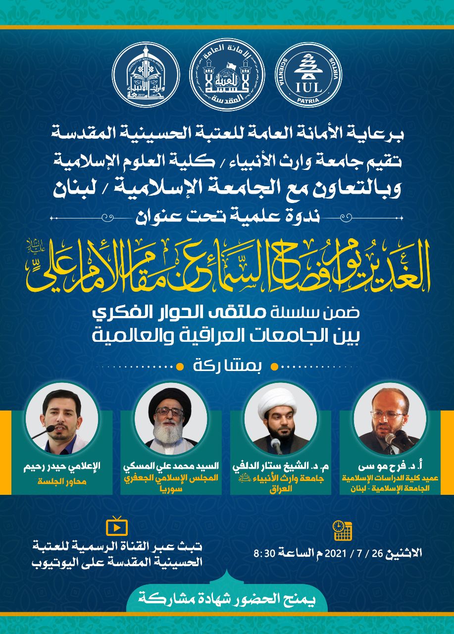 ندوة علمية بعنوان ( شبهات حول القرآن الكريم) يلقيها الدكتور نجاح حسين الحسناوي وبادارة م. م. ياسمين سلمان الطرفي في تمام الساعة الثامنة والنصف مساء من يوم السبت الموافق ٧ / ٨ /٢٠٢١ عبر منصة التعليم الإلكتروني الكوكل ميت