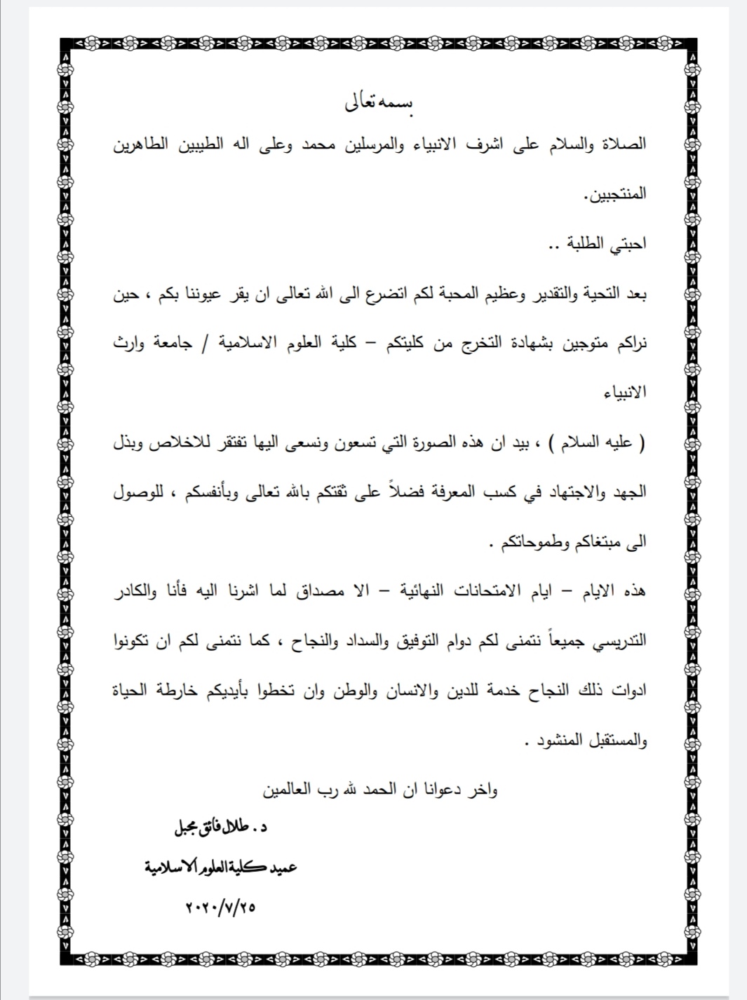 كلمات من الشكر والثناء والدعاء قدمها عميد كلية العلوم الإسلامية المحترم (الدكتور طلال فائق الكمالي) لأبنائنا واعزائنا الطلبة في نهاية العام الدراسي