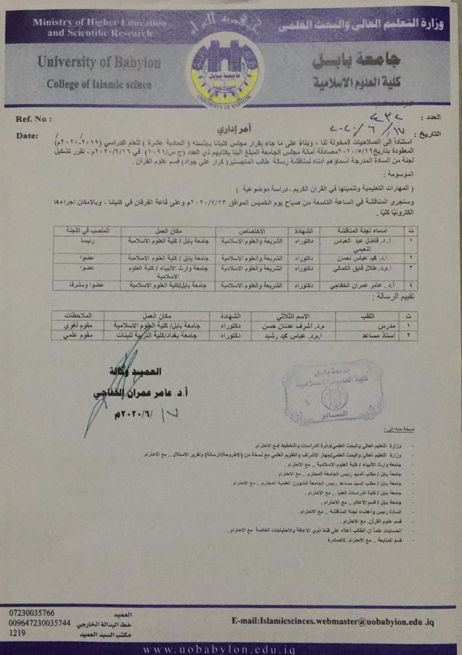 استضافت جامعة بابل / كلية العلوم الإسلامية (الدكتور طلال فائق الكمالي) عضواً في لجنة مناقشة رسالة الماجستير الموسومة (المهارات التعليمية وتنميتها في القرآن الكريم _ دراسة موضوعية) استنادا إلى الأمر الإداري المرقم ٤٣٢ بتاريخ 17/6/2020 وذلك في صباح يوم الخميس الموافق23/7/2020 على قاعة الفرقان