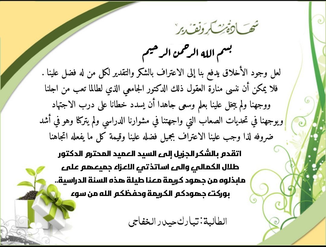 شكر وعرفان تقدم بها طلبة قس الفقه واصوله إلى عمادة وأساتذة كلية العلوم الإسلامية على ما بذلوه من جهد وتفاني طيلة السنة الدراسية