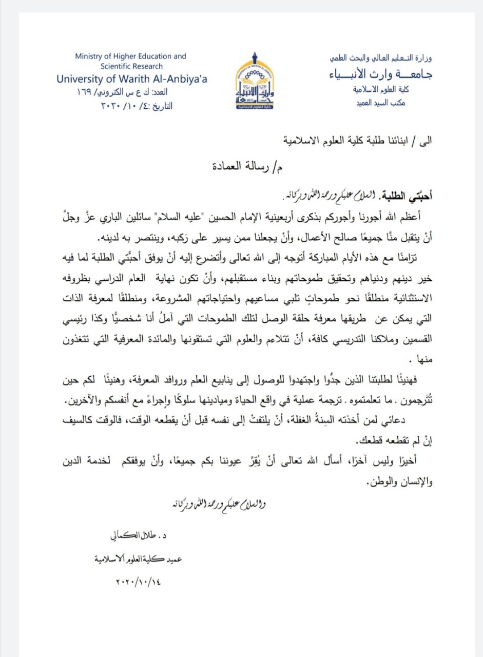 يبعث عميد كلية العلوم الإسلامية الدكتور طلال فائق الكمالي برسالة إلى طلبة الكلية يحثهم بها على المواظبة في طلب العلم