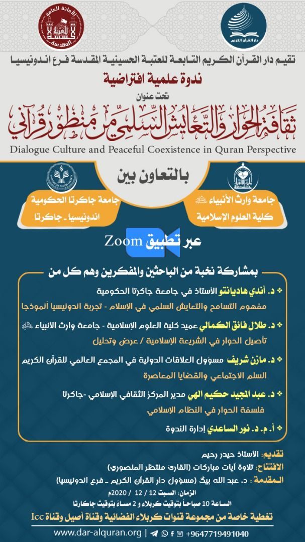 شاركت كلية العلوم الإسلامية / جامعة وارث الأنبياء في الندوة العلمية الافتراضية الموسومة ب ( ثقافة الحوار والتعايش السلمي من منظور قرآني) التي أقامها دار القرآن في العتبة الحسينية المقدسة فرع اندنوسيا بالتعاون مع جامعة جاكرتا الحكومية