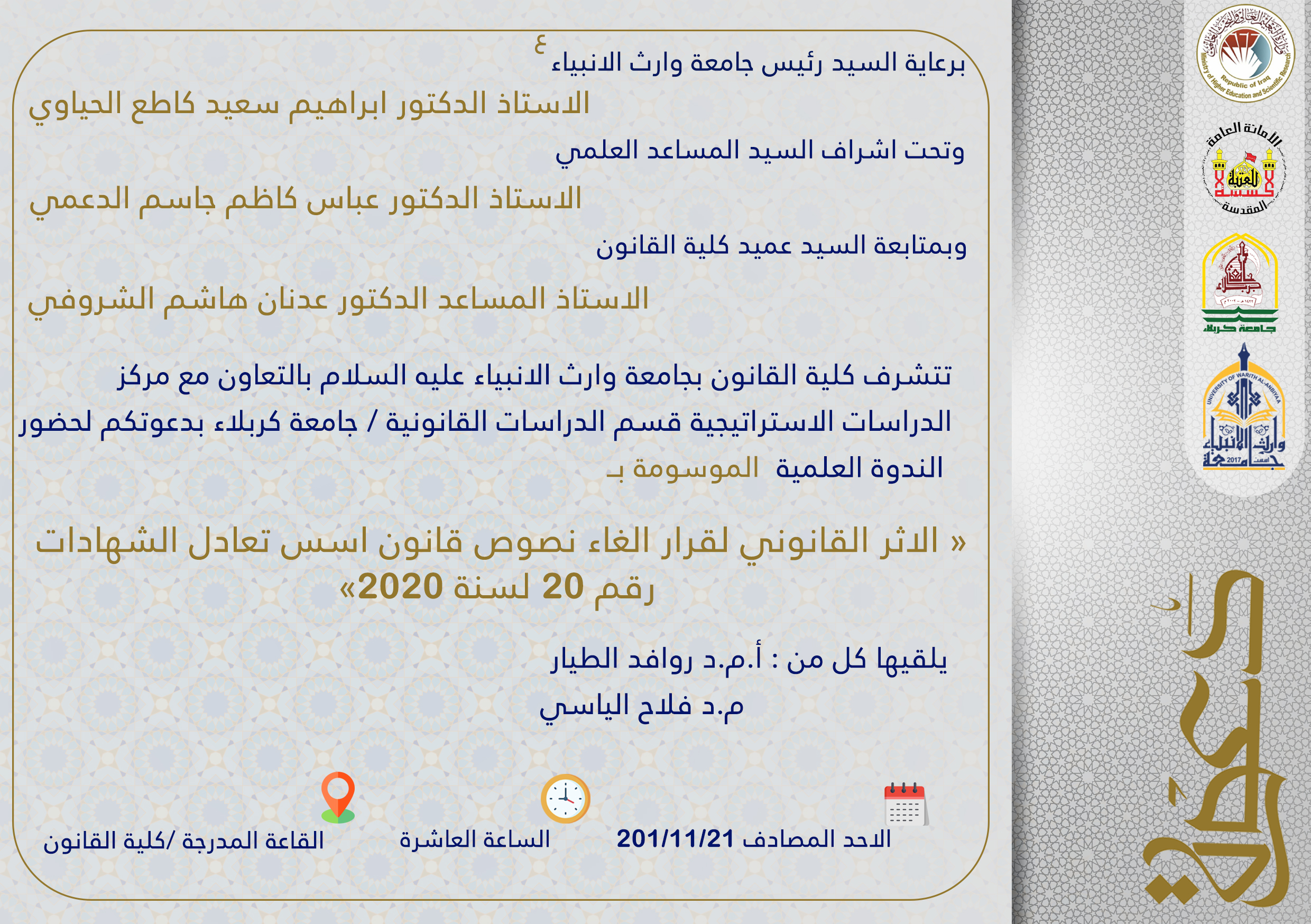 تتشرف كلية القانون بجامعة وارث الانبياء عليه السلام بالتعاون مع مركز الدراسات الاستراتيجية قسم الدراسات القانونية / جامعة كربلاء بدعوتكم لحضور الندوة العلمية الموسومة ب « الاثر القانوني لقرار الغاء نصوص قانون اسس تعادل الشهادات رقم 20 لسنة 2020» يلقيها