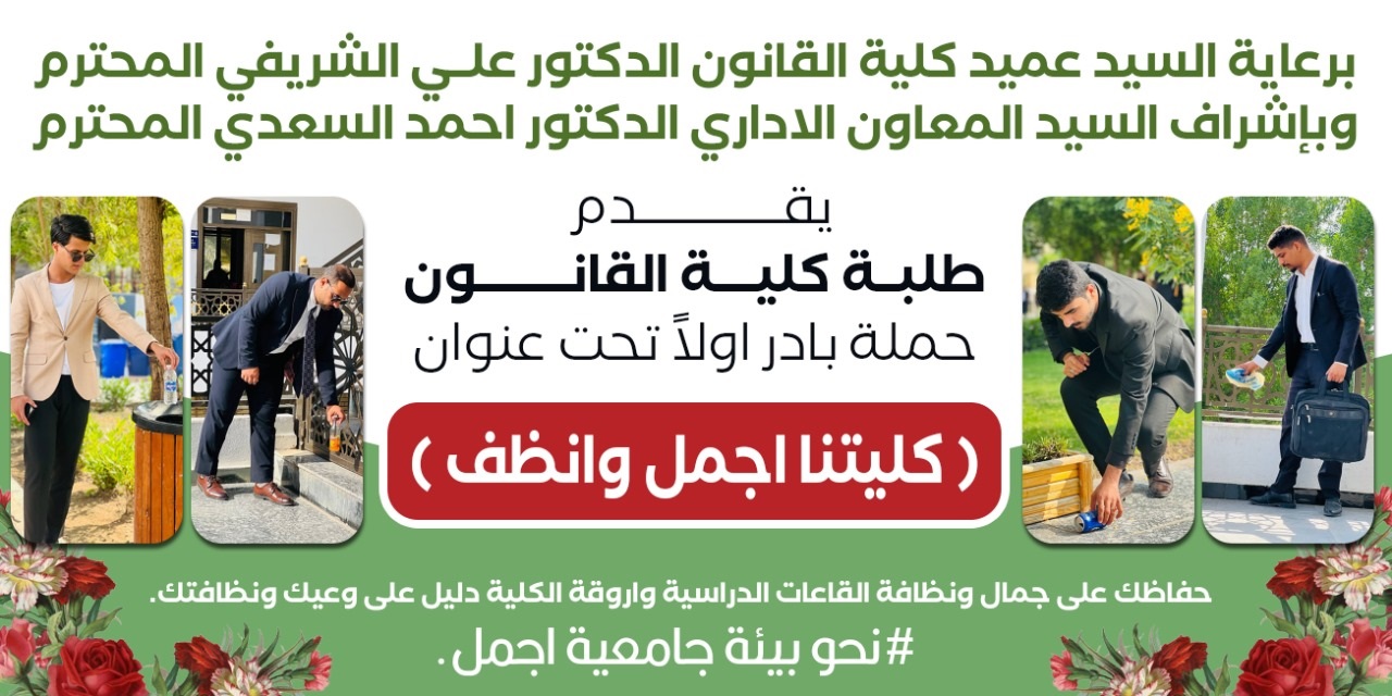 إقامة طلبة كلية القانون باشراف السيد عميد الكلية والسيد المعاون العملمي نشاط طلابي بعنوان " بادر اولا نحو بيئة جامعية أجمل وأنظف" هو مبادرة رائعة تساهم في تحسين بيئة الجامعة وتشجيع الطلاب على الوعي البيئي والمشاركة الفعّالة على تحسين بيئة الحرم الجامعي من خلال تعزيز النظافة والوعي البيئي بين الطلاب وجعل الجامعة أكثر نظافة وجمالًا، حيث يتعاون الجميع للحفاظ على البيئة الجامعية واتباع أسلوب حياة مستدام.