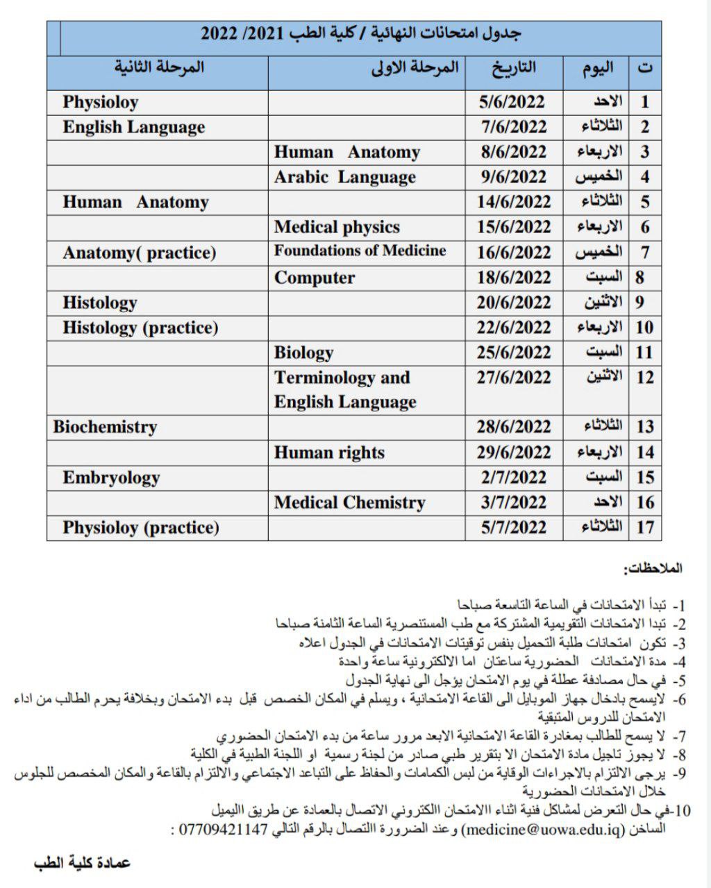 بأشراف رئاسة الجامعة وارث الانبياء عليه السلام ومتابعة السيد عميد كلية الطب الاستاذ الدكتور علي عبد سعدون والسيد معاون العميد للشؤون العلمية المدرس الدكتور رياض حنيوه أدى الطلبة امتحانات الدور الثاني متمنين لهم الموفقية والنجاح.