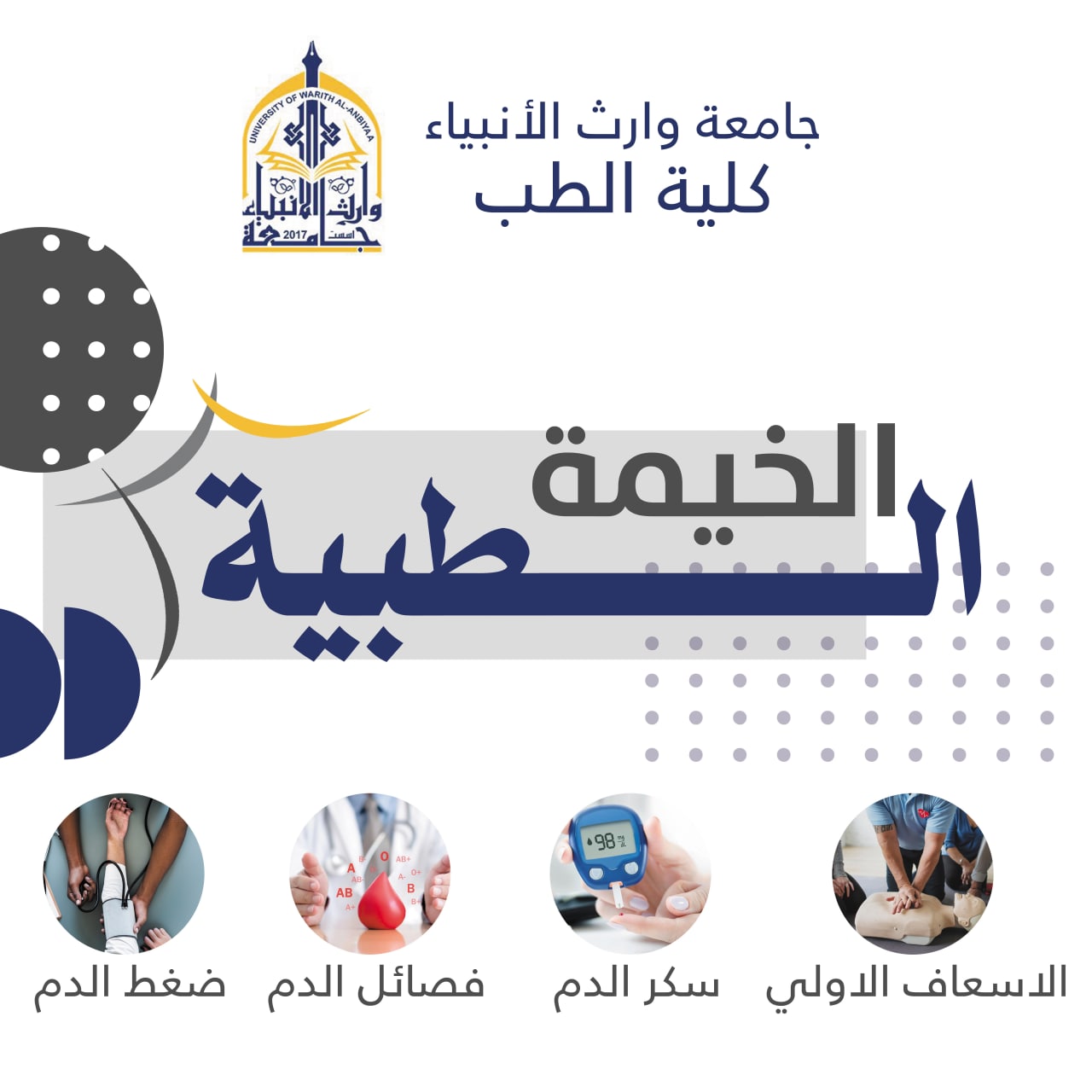 تقييم كلية الطب في جامعة وارث الانبياء احتفالية ابتهاجا بهذه المناسبة العظيمة وذلك عند الساعة الثانية عشر ظهرا يوم الثلاثاء الموافق لتاريخ ٢٢ / ٣ / ٢٠٢٢ م في القاعة المدرجة - بناية العصمةوفعاليات الخيمة الطبية التي تتضمن الاسعاف الاولي وقياس ضغط الدم وفصائل الدم ونسبة السكر في الدم وفحص النظر ومحطات توعوية عن الحروق وسحب الدم و كتلة الجسم