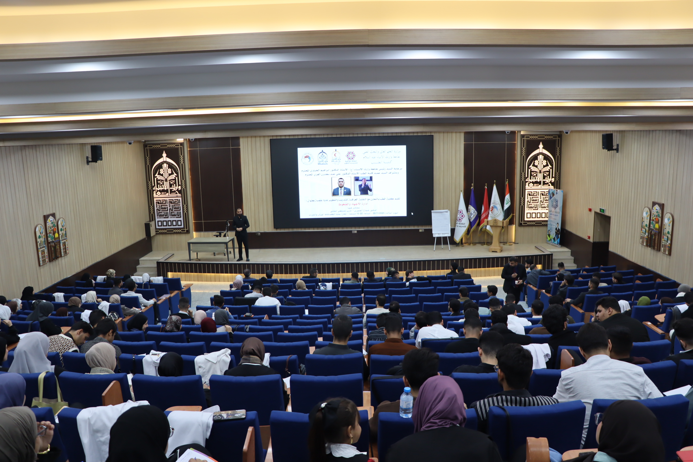 نظمت كلية الطب في جامعة وارث الأنبياء (ع) محاضرة توعوية بعنوان “إدارة الإجهاد والضغوط” بالتعاون مع نقابةالنقابة العراقية للتدريب و التطوير ، ألقاها كل من مصطفى الطائي وصباح الجبوري. وتهدف المحاضرة إلى رفع مستوى الوعي لدى الطلبة حول طرق التعامل مع الضغوط النفسية والإجهاد الأكاديمي والمهني، وتعزيز مهاراتهم في إدارة التحديات اليومية ضمن البيئة الجامعية والطبية.وأكدت عمادة كلية الطب على دعمها المستمر للمبادرات التوعوية التي تسهم في تنمية الصحة النفسية وبناء بيئة جامعية أكثر وعيًا وتفهّمًا.