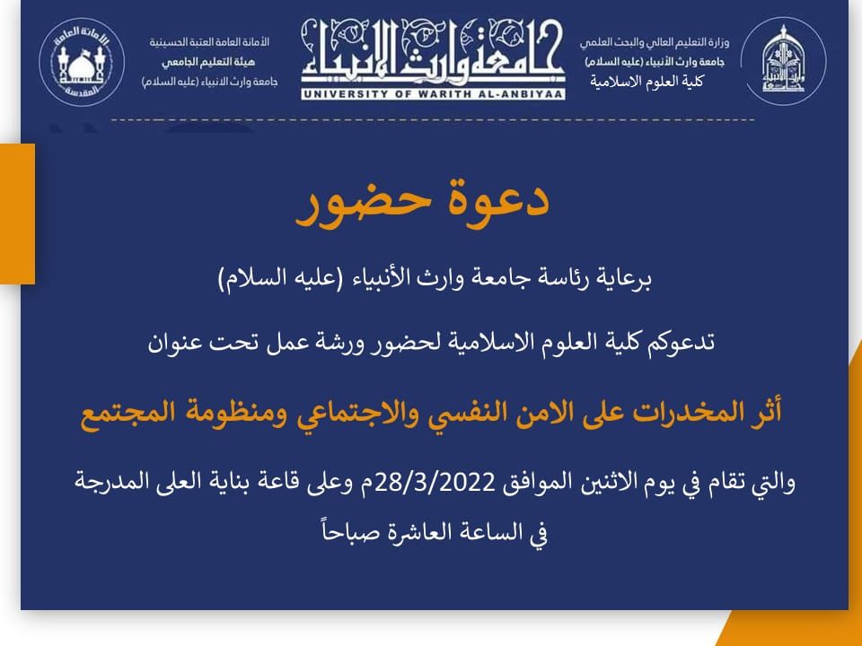 تقيم جامعة وارث الأنبياء _كلية الادارة والاقتصاد بالتعاون مع جمعية الهلال الاحمر دورة تدرييبه بعنوان الحد من مخاطر الادمان وذلك لمدة ثلاثة أيام تبدأ في يوم الثلاثاء الموافق٢٩ اذار وتنتهي في يوم السبت الموافق ٢نيسان من عام ٢٠٢٢ .تستهدف الدورة طلبه جامعة وارث الأنبياء/كلية الادارة والاقتصاد. الهدف من الدورة هو التوعيه من مخاطر الادمان فضلا عن تقديم الدعم النفسي للمساعدة والحد من مخاطر الادمان .وتعقد الدورة في بنايه العصمة الطابق الثاني في القاعة ٢٠٧ ؛ وكان من ابرز الحاضرين في الدورة الاستاذ الدكتور عباس كاظم الدعمي المساعد العلمي لرئيس جامعة وارث الأنبياء والاستاذ المساعد الدكتور انمار فالح ديكات مسؤول الشؤون العلميه في جامعة وارث الأنبياء ؛ والاستاذ المساعد الدكتور فهد الشمري المعاون العلمي لكليه الادارة والاقتصاد وعدد من الاخوة والاخوات التدريسيين