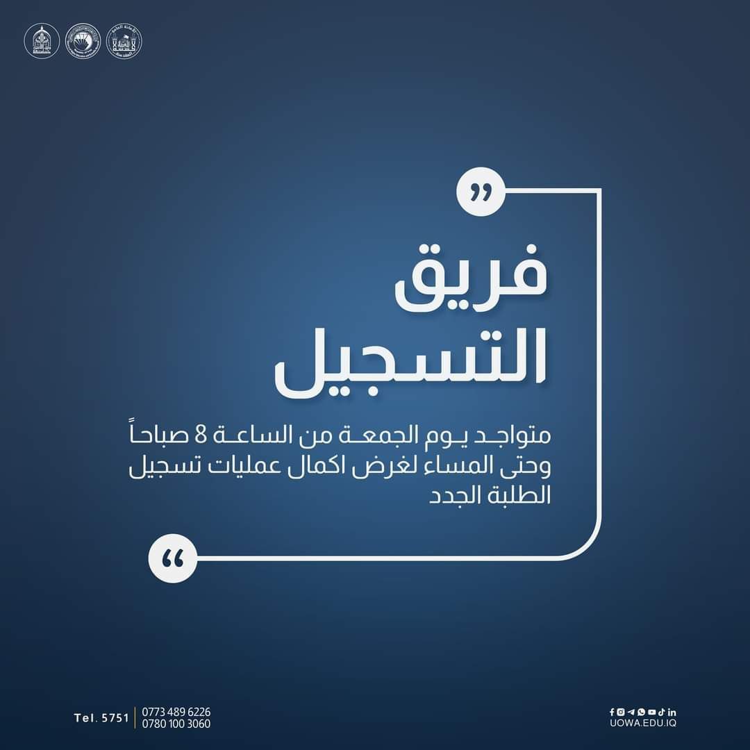 🔴 علما ان قسم التسجيل يستقبل الطلبة طيلة أيام الأسبوع، بما في ذلك العطل الرسمية والجمع، من الساعة 8 صباحاً وحتى المساء