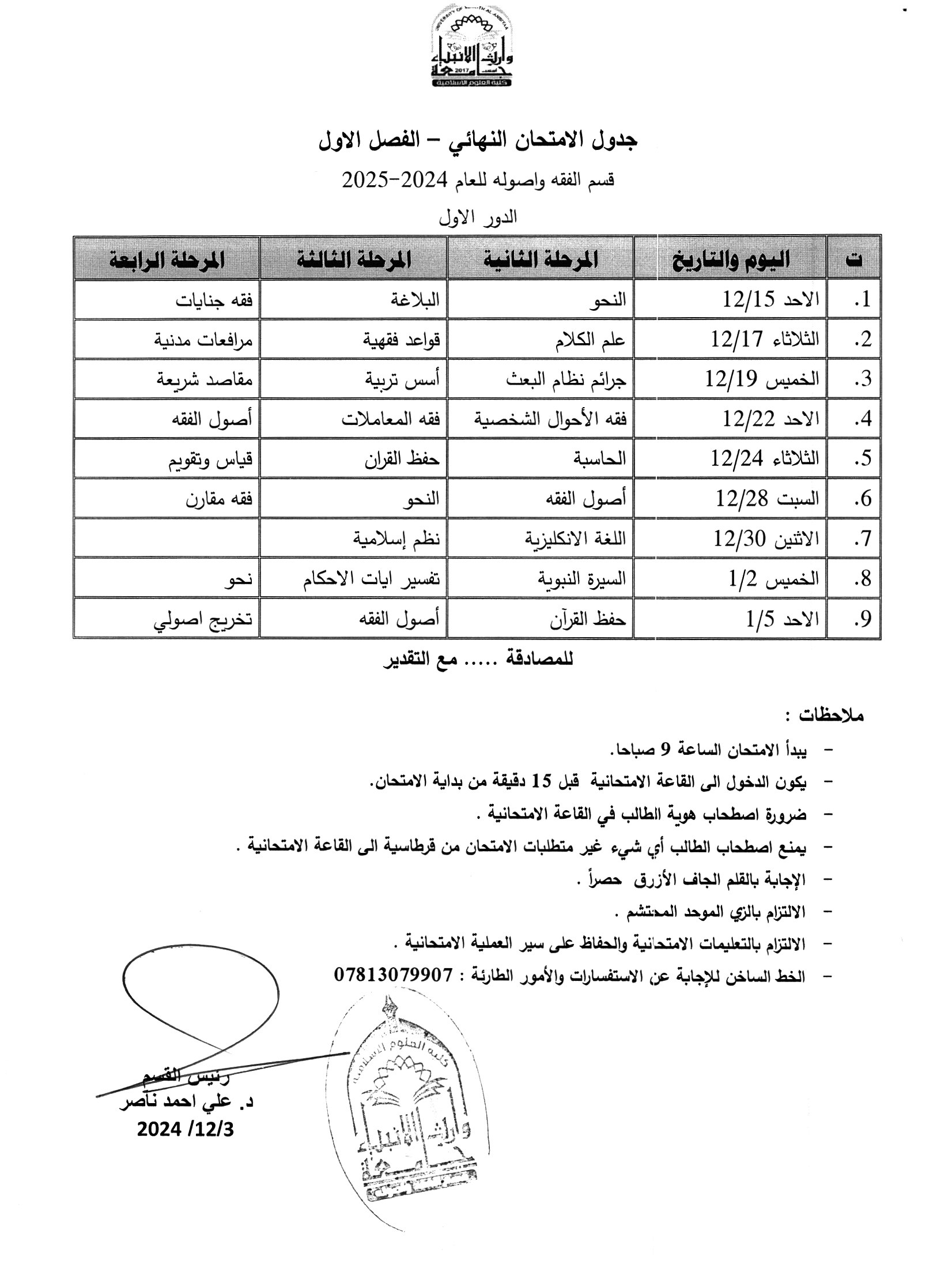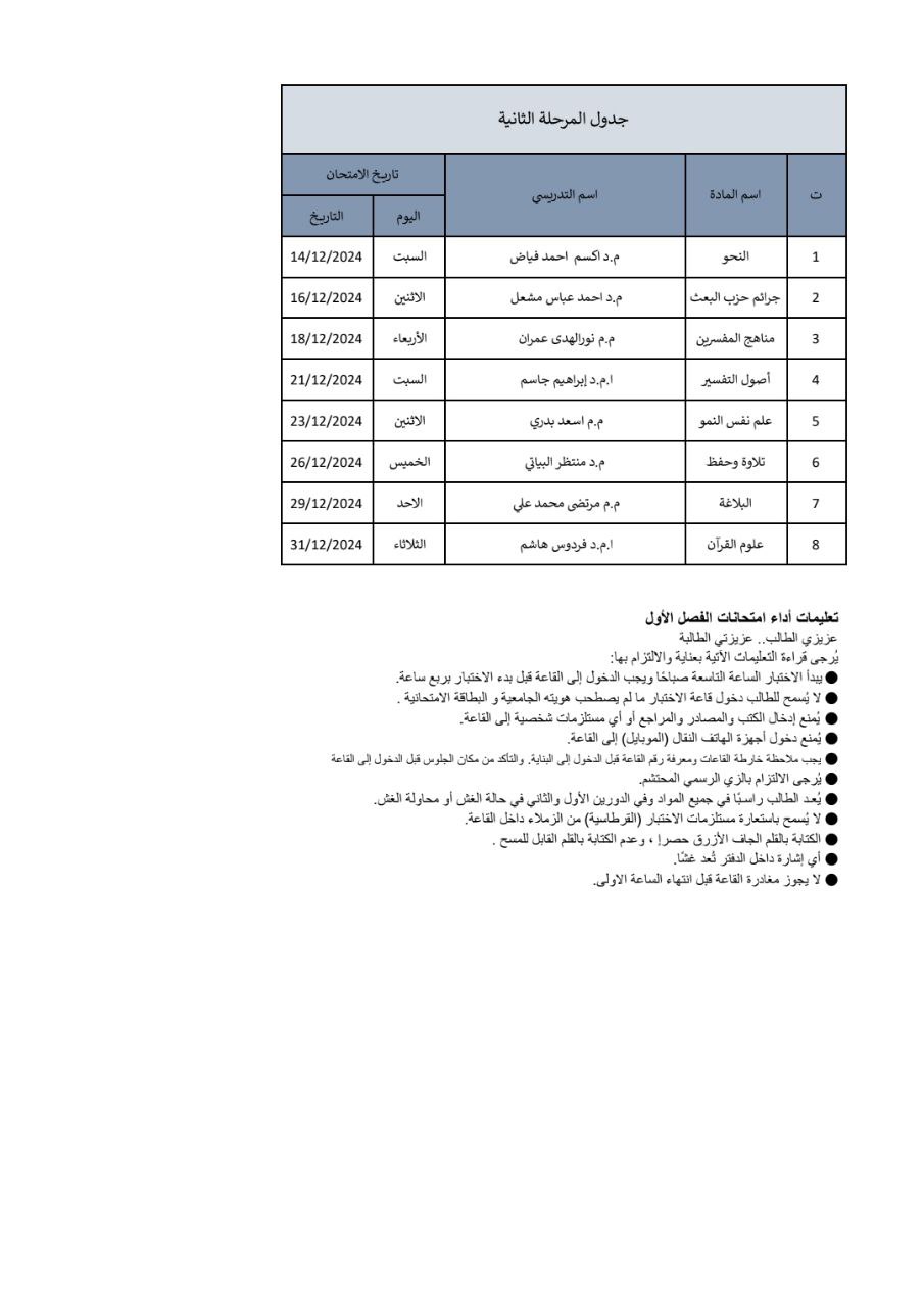 جدول امتحانات الكورس الأول قسم الفقه واصوله تعلن كلية العلوم الإسلامية في جامعة وارث الأنبياء (عليه السلام) عن انطلاق امتحانات الكورس الأول للعام الدراسي 2024-2025، وذلك ابتداءً من يوم السبت الموافق 14 ديسمبر 2024. وتتمنى عمادة الكلية لجميع الطلبة التوفيق والنجاح في أداء امتحاناتهم، مع التأكيد على الالتزام بالتعليمات الامتحانية والحضور في المواعيد المحددة لكل مادة. كما تدعو الكلية الطلبة إلى الاستعداد الجيد ومراجعة المواد الدراسية لتحقيق أفضل النتائج. ملاحظات مهمة للطلبة: - يرجى التواجد في القاعات الامتحانية قبل بدء الامتحان بوقت كافٍ. - الالتزام بإحضار الهوية الجامعية وباقي المستلزمات المطلوبة. - يُمنع استخدام الأجهزة الإلكترونية أو أي وسائل غير مسموح بها أثناء الامتحان. كل التوفيق والنجاح لطلبتنا الأعزاء!