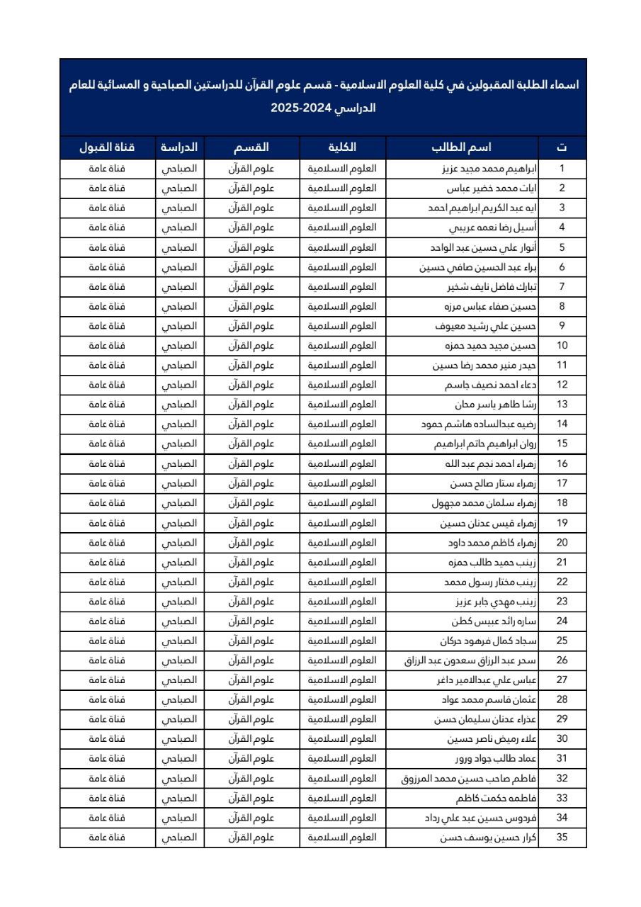 أسماء الطلبة المقبولين في كلية العلوم الإسلامية قسم علوم القرآن للعام 2024-2025