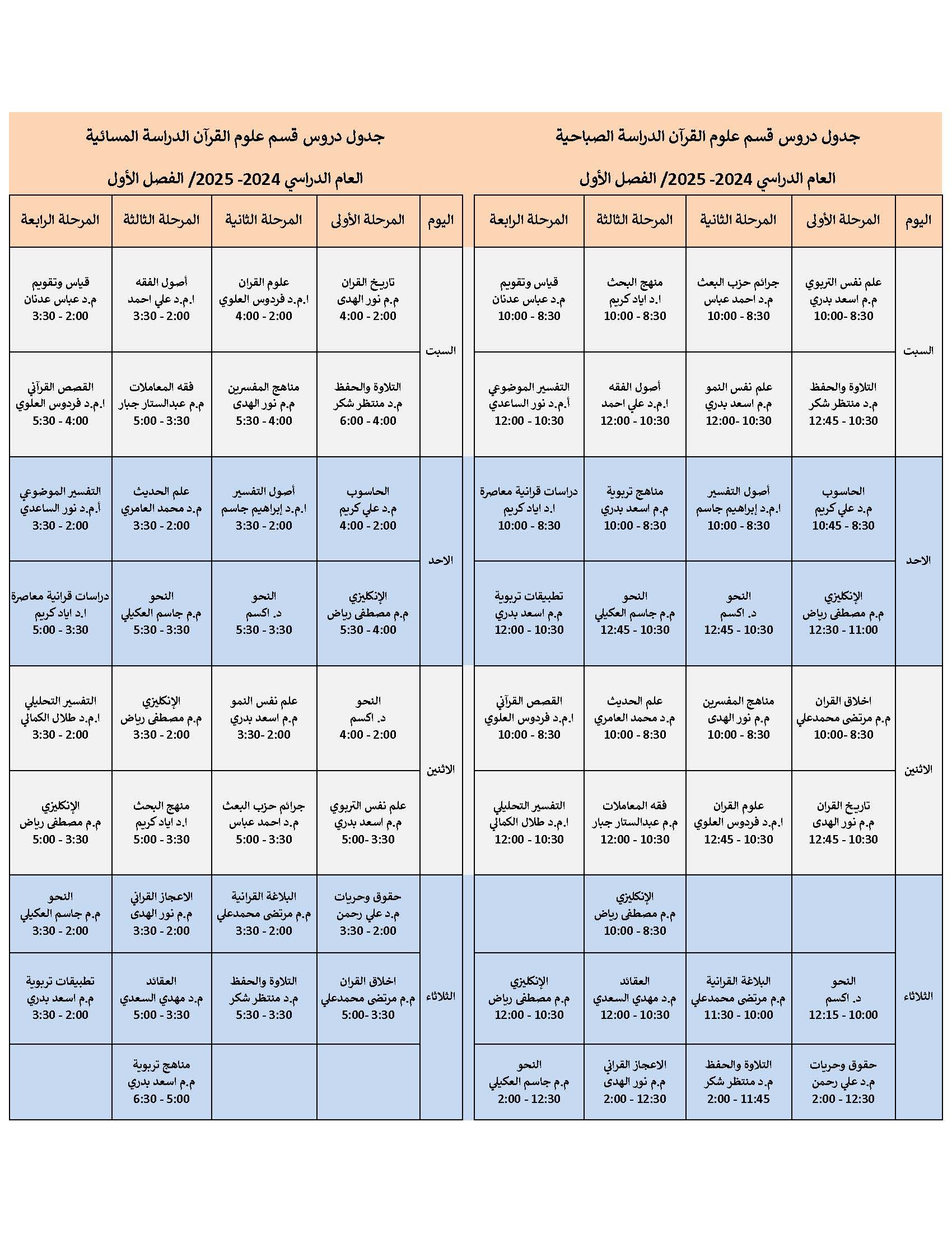 جدول الدروس الأسبوعي لقسم علوم القرآن