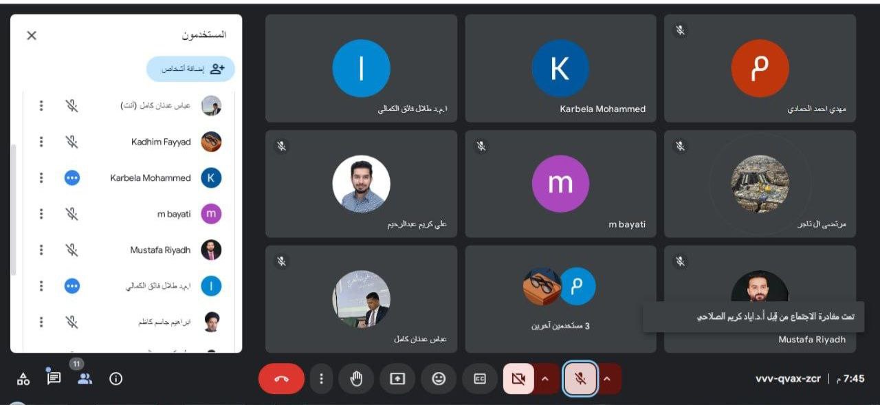 اجتمع السيد عميد الكلية، الأستاذ المساعد الدكتور طلال فائق الكمالي، بالكادر التدريسي للكلية عبر الفضاء الإلكتروني، وذلك بهدف اطلاعهم على الآليات التي ستُعتمد لإجراء الامتحانات النهائية، وفقًا للتعليمات الوزارية الخاصة بهذا الشأن.