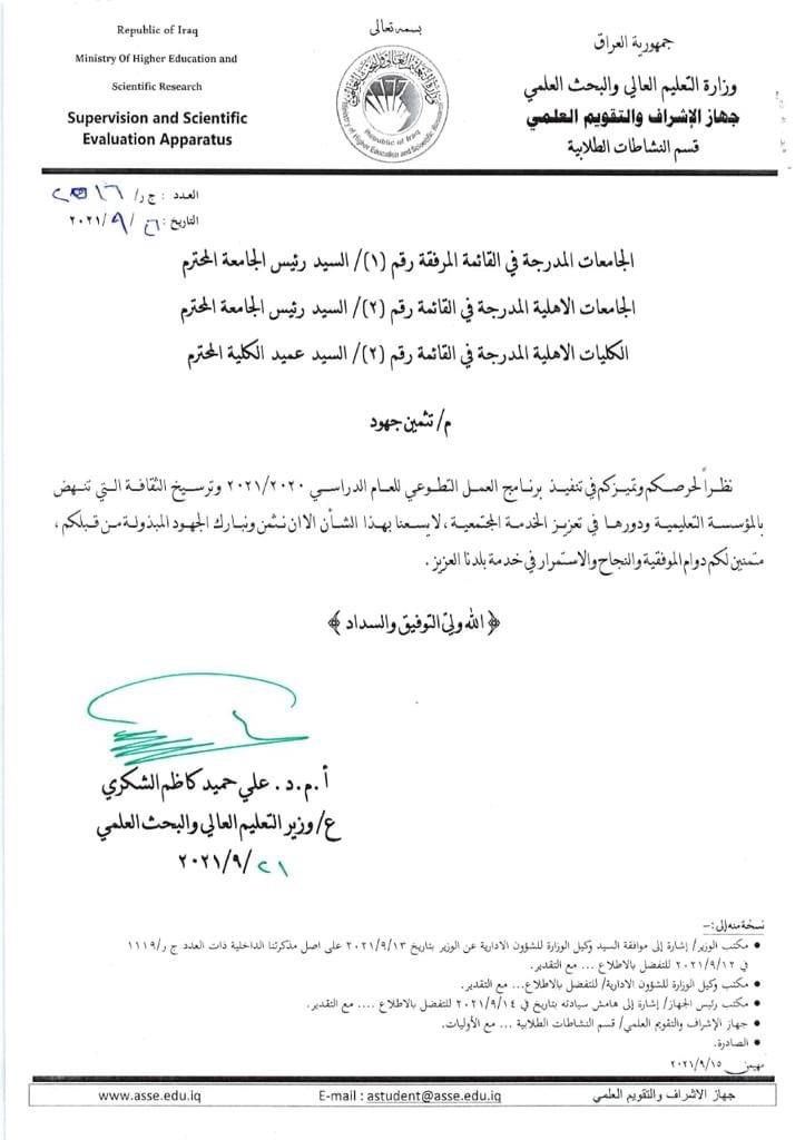 اخر موعد لتسليم الوثائق يوم 15/10/2021 على الطلبة احضار الوثيقة الاصلية للدراسة الاعدادية باسرع وقت ممكن وبخلافة يتم ترقين قيد الطالب حسب الاوامر الوزارية.