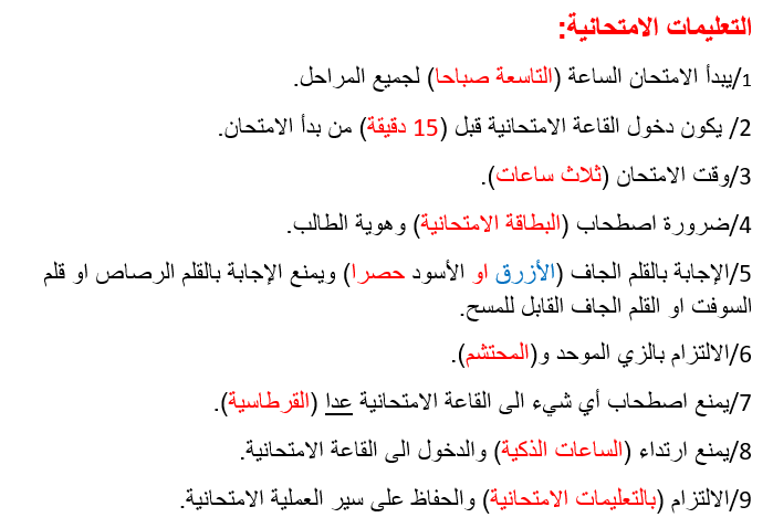 طلبتنا الاعزاء .. نرفق لكم جدول الامتحانات النهائية للفصل الاول من العام الدراسي 2023-2024 و للمراحل الثانية و الثالثة و الرابعة مع التعليمات الامتحانية  متمنين لكم دوام التوفيق و النجاح.