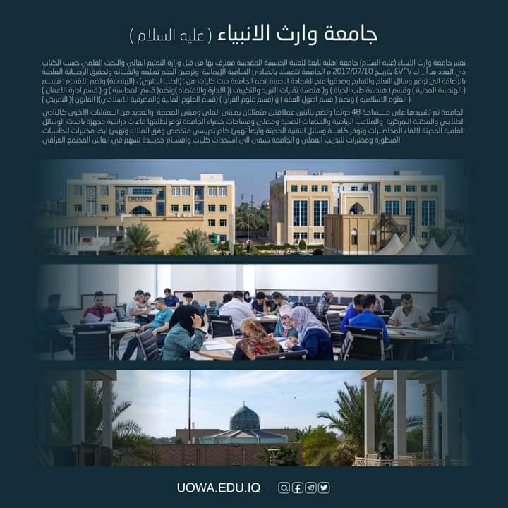 شاركت رئاسة جامعة وارث الانبياء(عليه السلام) متمثلة بالسيد المساعد العلمي الاستاذ الدكتور عباس الدعمي والسيد عميد كلية الهندسة الاستاذ المساعد الدكتور حاكم سماوي سلطانبأعمال المؤتمر العلمي الذي اقامته وزارة التعليم العالي والبحث العلميّ بعنوان(نظام بولونيا بروسس) و (اطلاق الخطة الوطنية للتعليم العالي)