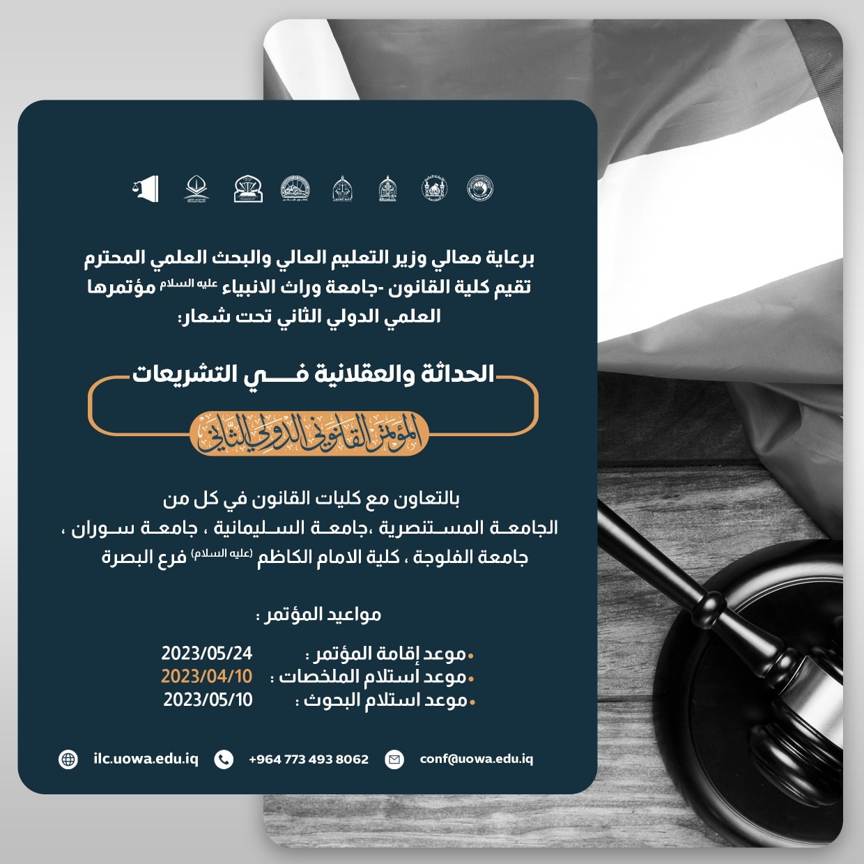 المؤتمر القانوني الدولي الثاني تحت شعار "الإصلاح التشريعي مقدمة لبناء الدولة القانونية" ينعقد المؤتمر في رحاب جامعة وارث الأنبياء (عليه السلام) بتأريخ 20-7-2022