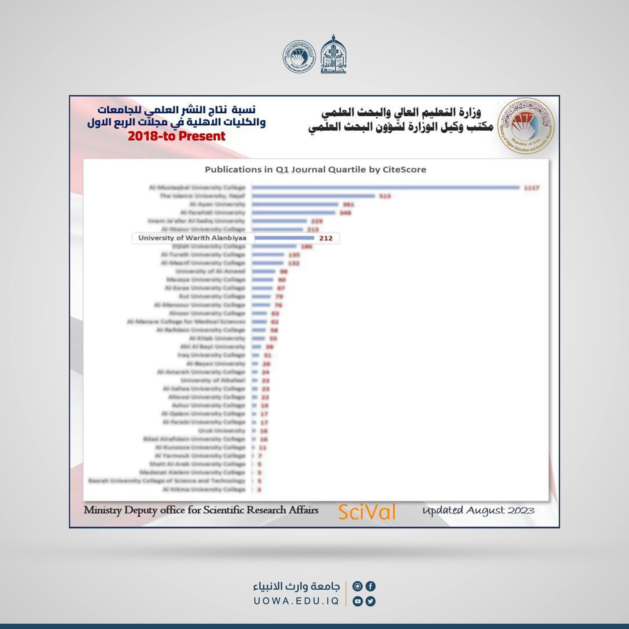 في عالم يشهد تطورًا متسارعًا في مختلف المجالات العلمية ، تمكنت جامعة وارث الانبياء(عليه السلام) وبعمرها القصير من الحصول على مرتبة متقدمة في "تصنيف الجامعات والكليات الاهلية بنسبة النشر العلمي ضمن مجلات الربع الاول(Q1)"