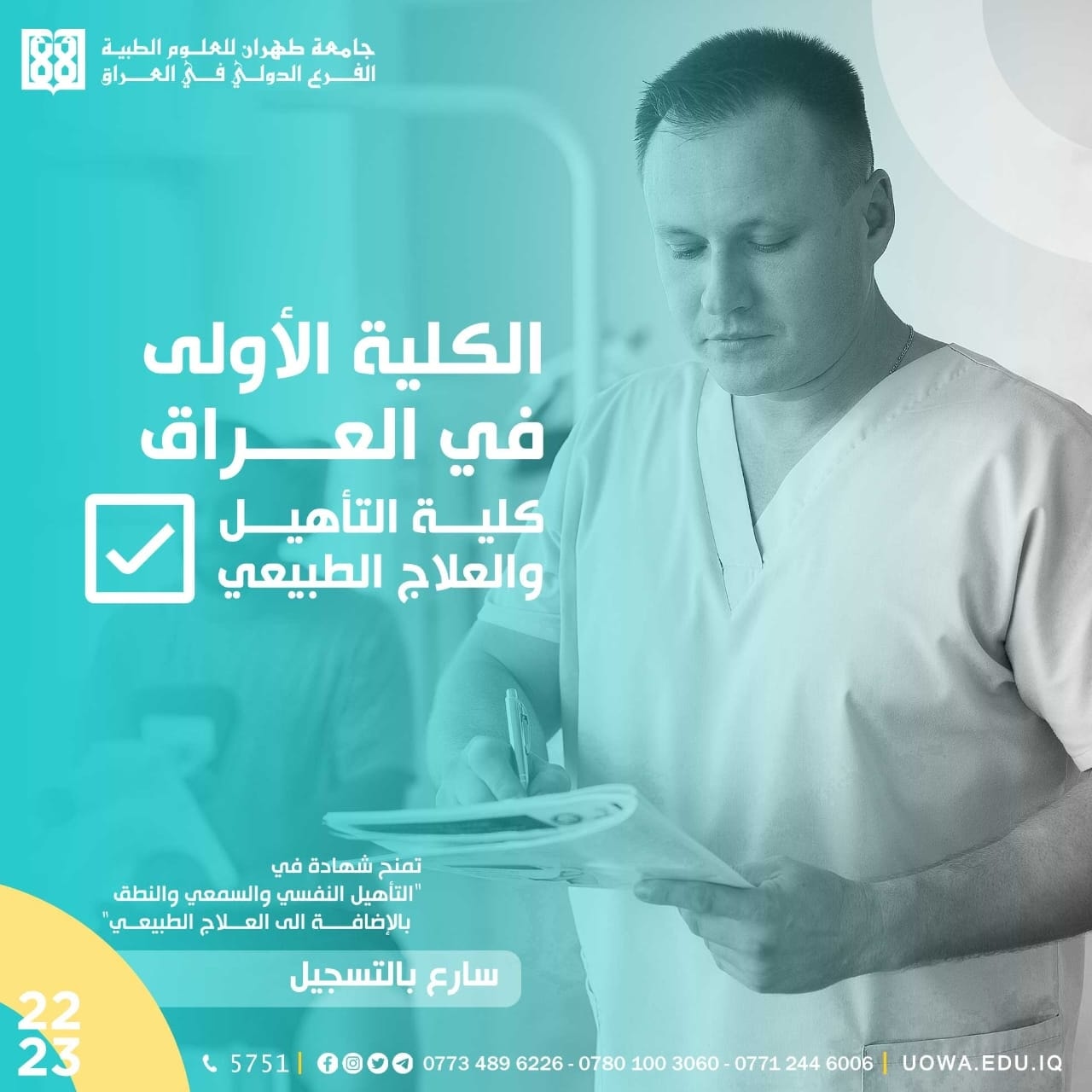 *اعزاءنا الطلبة اغتنموا الفرصة باختياركم "الكلية الاولى في العراق" والوحيدة التي تمنح شهادة في" التأهيل النفسي والسمعي والنطق بالإضافة الى العلاج الطبيعي" وتكون الدراسية فيها لاول سنتان (دراسة عامة) والتي تليها دراسة "تخصصية".