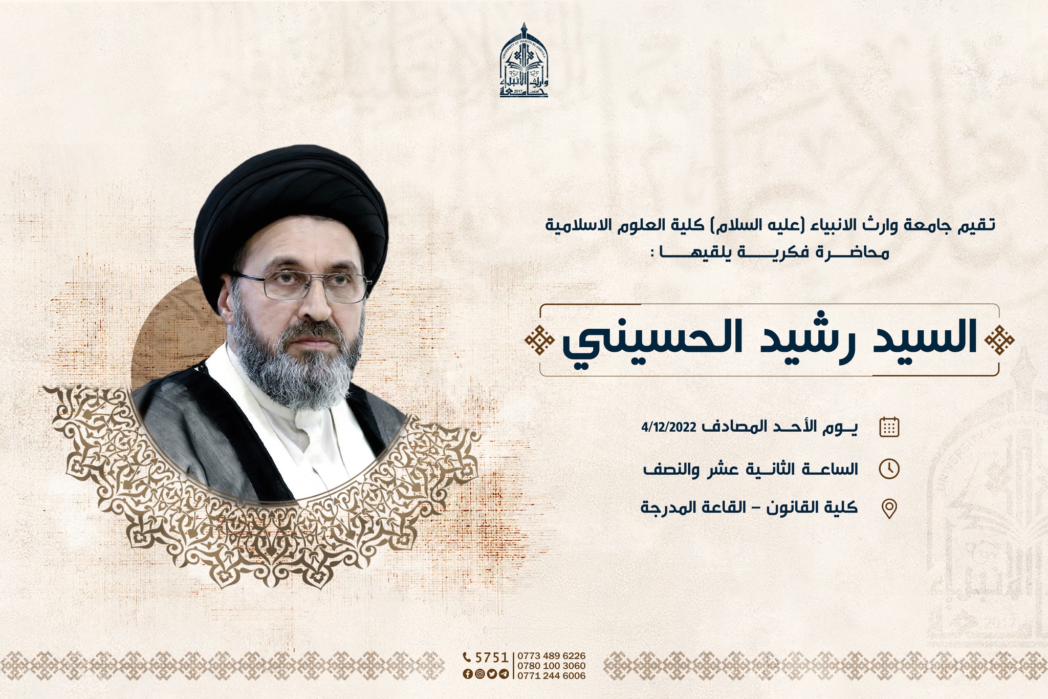 تقيم جامعة وارث الانبياء (عليه السلام)/ كلية العلوم الاسلامية، محاضرة فكرية يقدمها السيد رشيد الحسيني، وذلك على القاعة المدرجة في كلية القانون، وذلك يوم الاحد 4-12-2022 في تمام الــ (12:30) ظهراً.