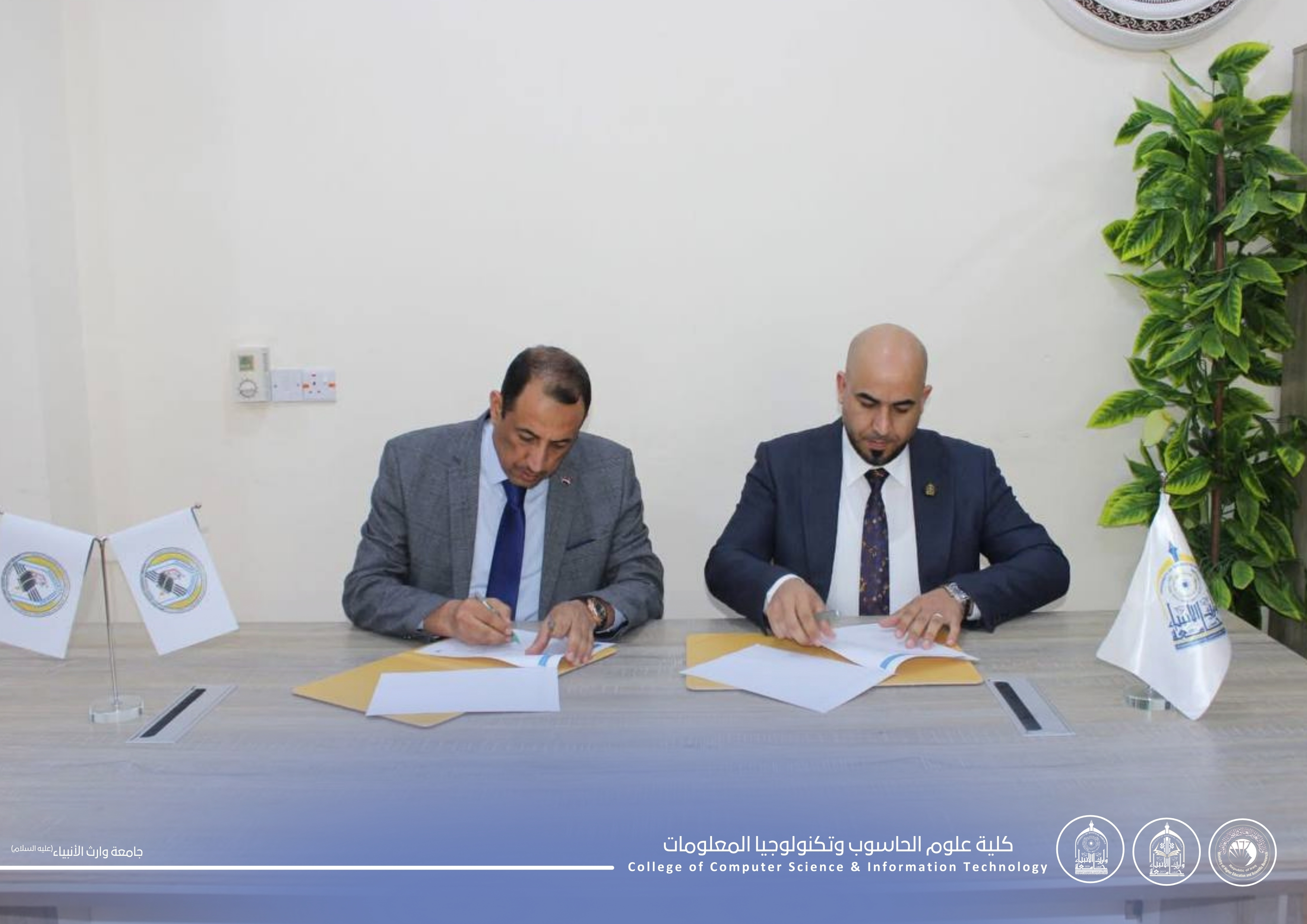 As part of strengthening academic cooperation and the exchange of scientific expertise, Assistant Professor Dr. Haider Mohammed Ali Al-Ghanmi, Dean of the College of Computer Science and Information Technology at the University of Warith Al-Anbiyaa (peace be upon him), signed a scientific twinning agreement with Professor Dr. Salah Awad Salman Al-Issawi, Dean of the College of Computer Science and Information Technology at the University of Anbar. The agreement includes the Department of Artificial Intelligence in our college and the Department of Artificial Intelligence at the University of Anbar.