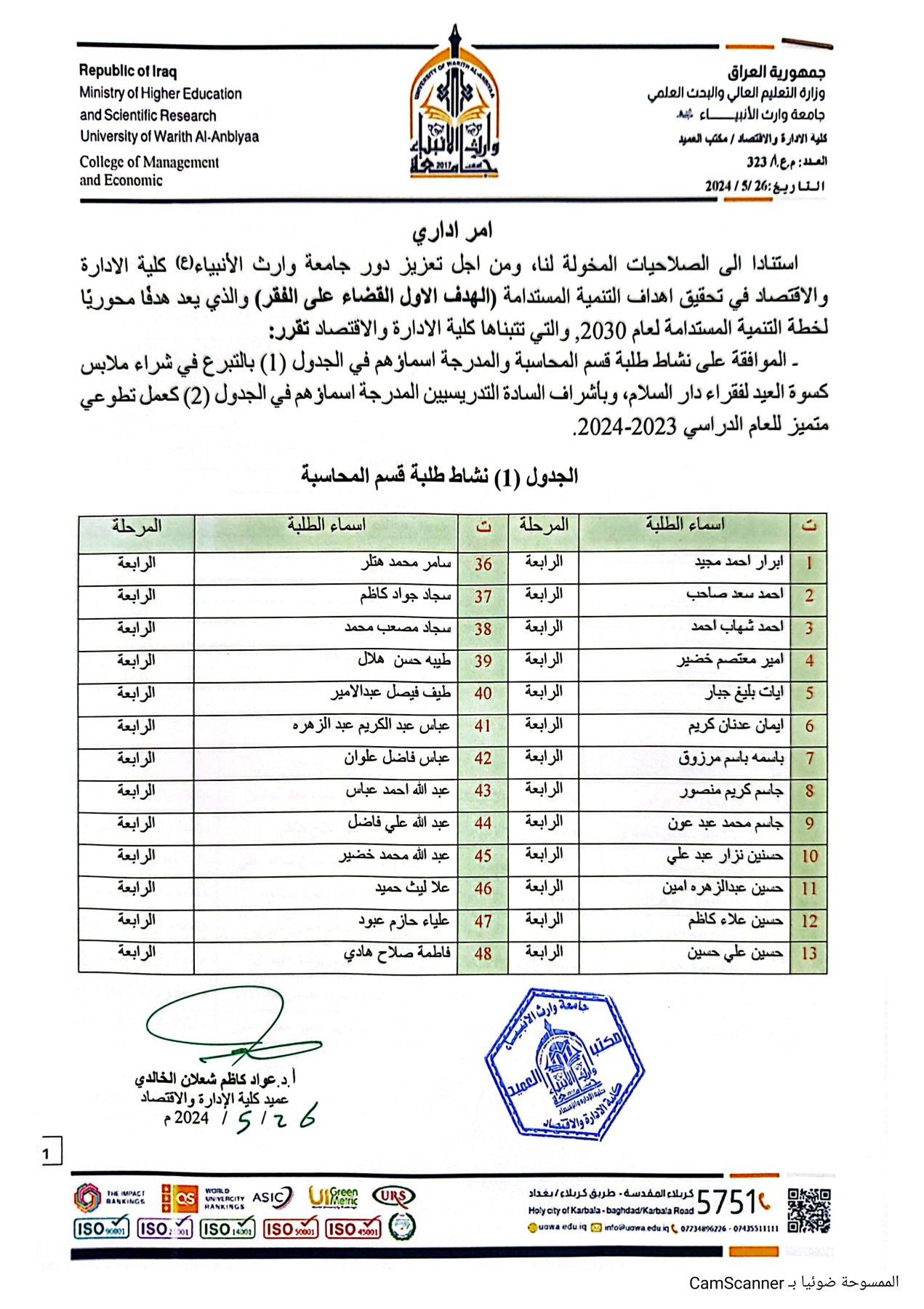 The College of Administration and Economics, along with its students, organized a voluntary initiative to buy Eid clothing for the poor at Dar Al-Salam, promoting the spirit of social solidarity and supporting the community.