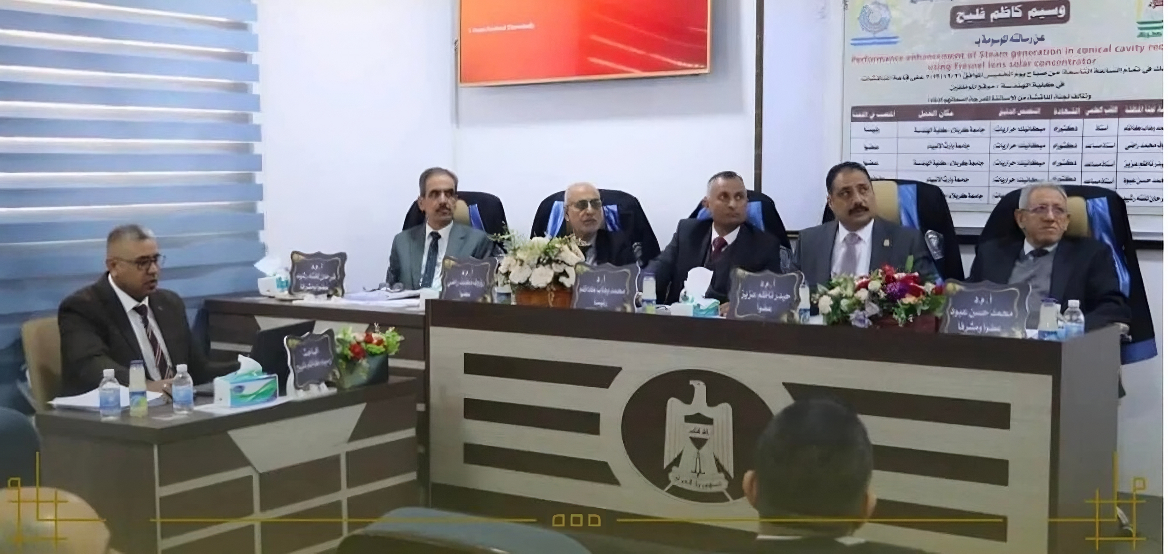 The Head of the Department of Refrigeration and Air Conditioning Engineering at the College of Engineering/University of Heir al-Anbiya (peace be upon him), Assistant Professor Dr. Muhammad Hassan Abboud (member and supervisor), and Assistant Professor Dr. Raouf Muhammad Radi (member) participated in the discussion of the master’s thesis that was conducted within the Mechanical Engineering Department at the University of Karbala. He discussed the thesis of researcher Waseem Kazem Falih entitled (Improving the performance of steam generation in conical cavity receivers using a Fresnel lens)The study aims to increase the efficiency and productivity of the solar steam generation system by using conical cavity receivers, a glass cover, and a Fresnel lens of both linear and dot types..