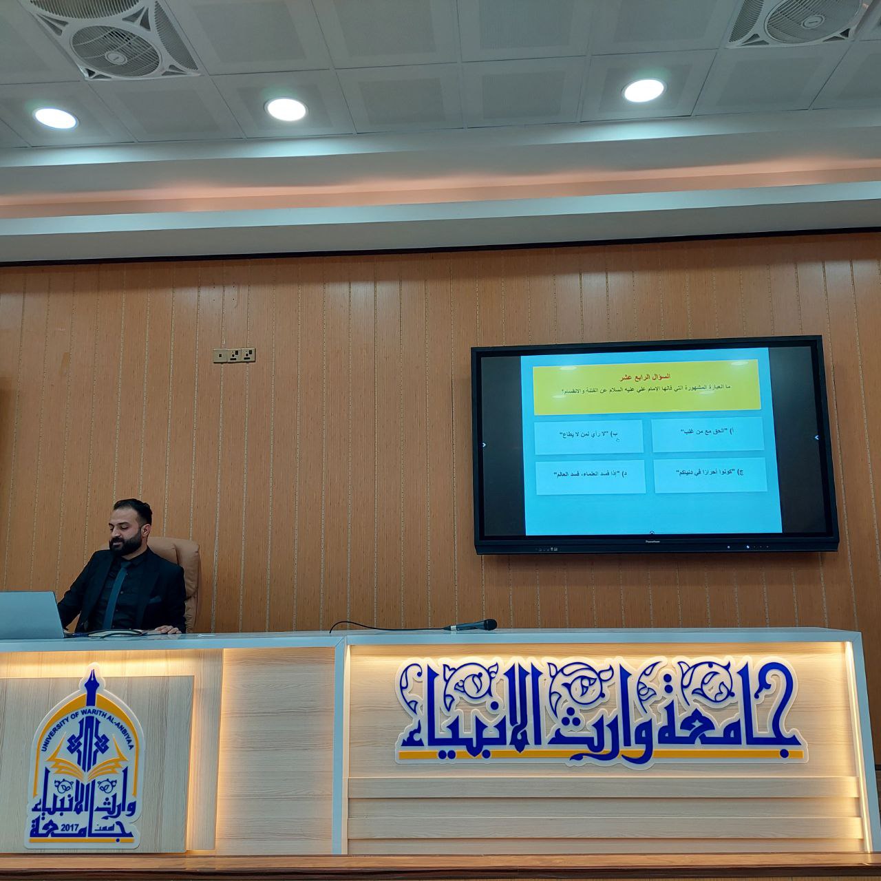 The College of Islamic Sciences at Warith Al-Anbiya University organized a cultural and religious event to commemorate the martyrdom anniversary of the Commander of the Faithful, Imam Ali ibn Abi Talib (peace be upon him). The event was attended by faculty members, students, and university staff.