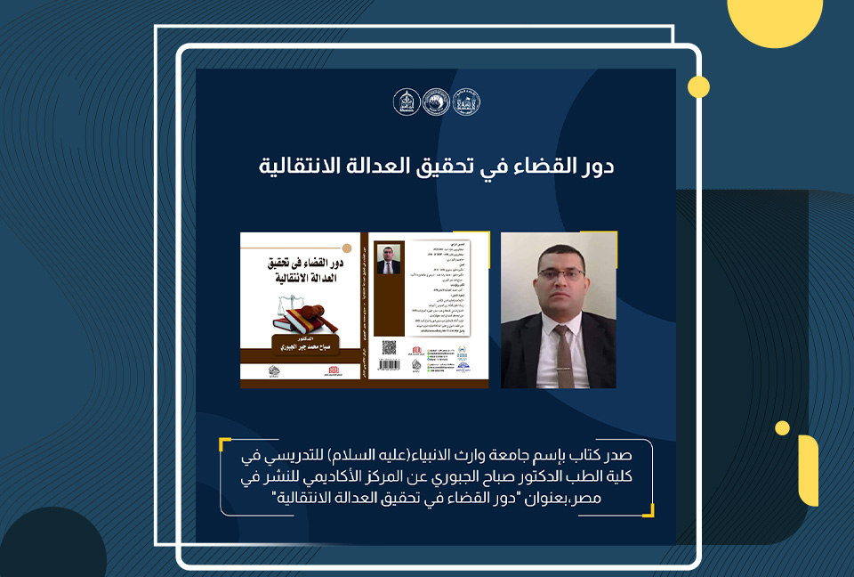 Dr. Sabah Al-Jubouri, a lecturer at the College of Medicine at the University of Warith Al-Anbiyaa (PBUH), issued a new book entitled “The Role of Judiciary in Achieving Transitional Justice.” In the book, which was released by the Academic Publishing Centre in Egypt, Al-Jubouri examines how the court helps transitional justice processes in societies that are going through change.